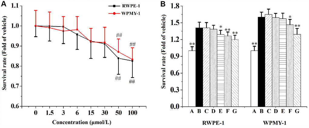 Figure 6A represents the effects of swertiamarin on RWPE-1 and WPMY-1 cells proliferation. It was found that cultured with 1.5, 3, 6, 15 or 30 μmol/L swertiamarin for 48 h did not increase or decrease (P>0.05) the survival rates of RWPE-1 and WPMY-1 cells compared to the vehicle control. However, cultured with 50 or 100 μmol/L swertiamarin for 48 h significantly decreased the survival rates of RWPE-1 and WPMY-1 cells compared to the vehicle control.