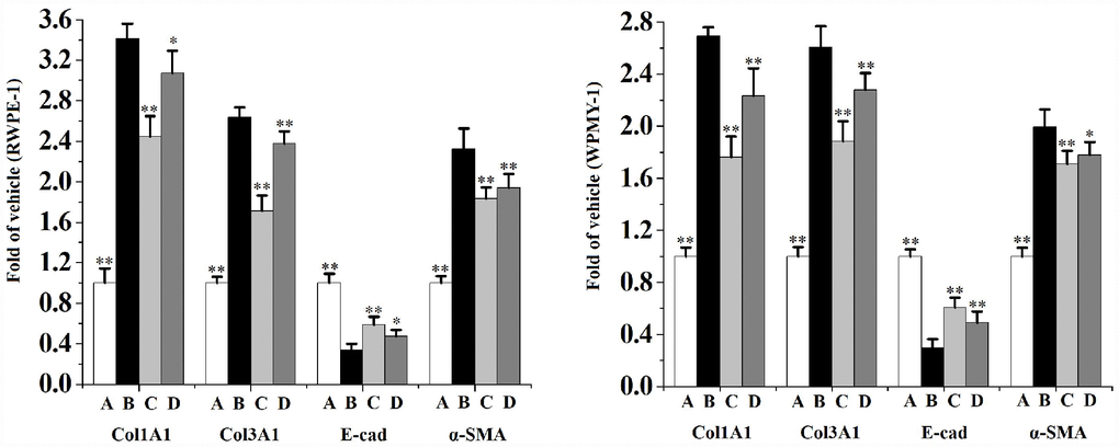 The prostatic EMT was analyzed by measuring the mRNA levels of EMT markers α-SMA and E-cad via qPCR and by detecting the protein expression of α-SMA and E-cad via western blot. The primer sequences of α-SMA and E-cad were showed in Table 1. GAPDH was used as the internal standard.