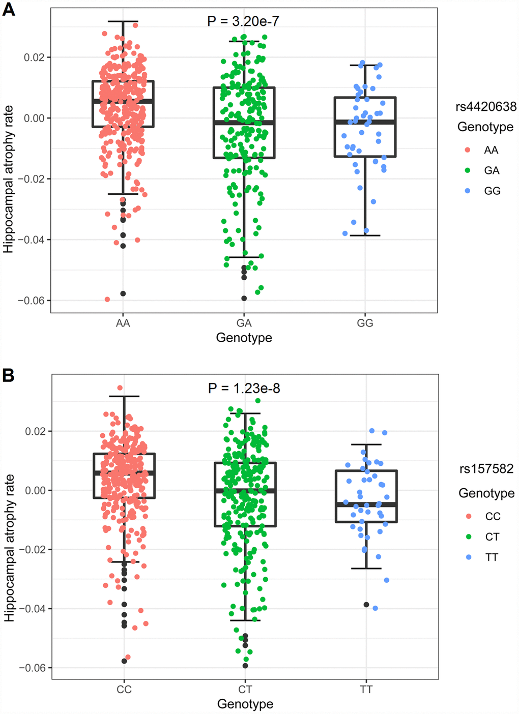 There were 602 individuals identified for GWAS. After adjusting for age, gender, years of education, intracranial volume (ICV), MRI and the first three multidimensional scaling (MDS) components, 3 SNPs on chromosome 19, including rs4420638 in the APOC1 gene (minor allele frequencies (MAF) = 0.1510, P = 9.32 × 10-9), rs56131196 in the APOC1 gene (MAF = 0.1508, P = 1.10 × 10-8) and rs157582 in the TOMM40 gene (MAF = 0.2937, P = 2.78 × 10-8), exhibited genome-wide significant associations with hippocampal atrophy rate (Figure 1A and Table 2). Their association signals disappeared after including APOE ε4 dosage as a covariate (Supplementary Figure 2). Strong linkage disequilibrium (LD) (R2 = 0.987, D’ = 0.993) between rs4420638 and rs56131196 was found, which was calculated using the 1,000 Genomes European cohort (Supplementary Figure 3). Accordingly, rs4420638 and rs157582 were chosen as the two top SNPs, for which the minor allele of rs4420638 (G) (AA: 0.003478 ± 0.012252, AG: -0.003415 ± 0.017455, GG: -0.003895 ± 0.013808; P = 3.20 × 10-7) and the minor allele of rs157582 (T) (CC: 0.003567 ± 0.012731; CT: -0.002717 ± 0.016733, TT: -0.004347 ± 0.012037; P = 1.23 × 10-8) were significantly associated with higher hippocampal atrophy rate in a dose-dependent manner (Figure 2).
