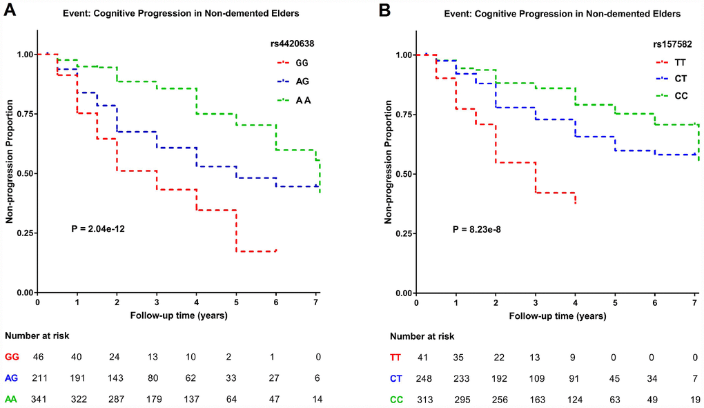 R software was also applied to explore the correlations of top SNPs with cognitive scores (MMSE score and ADAS-cog 11 score) and specific brain structures (entorhinal volume and ventricular volume) after adjusting for age, gender, years of education, ICV and MRI. The associations of top SNPs with the above indexes from both cross-sectional and longitudinal perspectives were determined using the multiple linear regression and linear mixed models, respectively. In the survival analysis, Kaplan-Meier survival curves were used to present trajectories of cognitive progression and COX regression model with age and gender as covariates was used to investigate the influence of two top SNPs on cognitive decline.