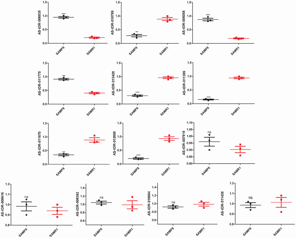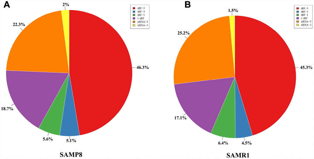 tRF expression levels were measured and normalized as read counts per million of total aligned tRF reads. tRFs with fold changes ≥ 2 and p < 0.01 were selected as the significantly differentially expressed tRFs between SAMP8 and SAMR1.
