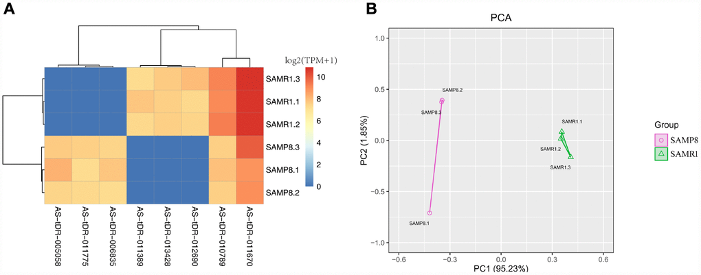 We used transcripts per million (TPM) to estimate the expression of the tRF transcripts. The levels of each subtype showed a similar proportion between the two groups. The percentages were approximately 45% tRF-5, 26% tiRNA (2% tiRNA-3 and 24% tiRNA-5), 19% i-tRF, 5% tRF-3, and 5% tRF-1 (Figure 1A and 1B). As a result, 13 differentially expressed tRFs were identified (p < 0.01 and fold changes ≥2). To validate the changes detected by RNA-seq, all 13 tRFs were selected, and their expression was further examined by quantitative polymerase chain reaction (qPCR). As shown in Figure 2, eight of the 13 transcripts whose levels were measured showed differential expression in SAMP8 and SAMR1 brains (p < 0.01, Supplementary Table 1). This result was inconsistent with the RNA-seq data possibly because of the biological differences between samples. Then, principal component analysis and cluster analysis were performed for the eight differentially expressed tRFs (Figure 3A and 3B). In the SAMP8 group, three samples were clustered together. The same situation occurred in the SAMR1 group.