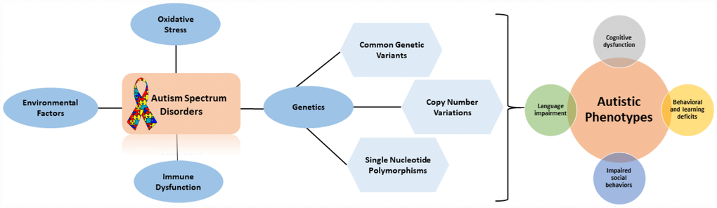 Autism spectrum disorder (ASD) is a complex neurological disorder that affects an individual’s development by impairing social interaction and communication and causes stereotypical behaviors that disrupt the anatomy and functional connectivity in the brain. Most common psychiatric comorbidities found to be associated with autism include anxiety and intellectual disability. Individuals with autism have impaired speech [1, 2] and tend to have limited social interaction mostly due to their own limitation of social skills and due to their failure to understand self-inner mental states [3]. The impairment of speech in affected individuals depends on the severity of the autism disorder as autistic individuals tend to repeat certain words or phrases they hear others say, their speech might sound more formal and they exhibit repetitive behaviors [4]. The prevalence of autism is on the rise and the global prevalence of ASD has been reported to be 1 in 160 persons, according to the World Health Organization (WHO) (2014). Based on a parent survey, the recent prevalence of ASD in the U.S. is reported to be 1 in 45 children [5]. A study conducted in 2006 in the United Kingdom reported an ASD prevalence of 38.9/10,000 in 9 to 10-year-olds [6], while another study conducted by the National Autistic Society (2014) reported that 1/100 children are affected with ASD. In Gulf Cooperation Council (GCC) countries, the prevalence of ASD was reported to range from 1.4–29 in 10,000 individuals [7]. The rise in the prevalence of ASDs is a result of many contributing factors. Some researchers believe in the biome depletion theory, which states that an overreaction of maternal immune response is an underlying factor responsible for the development of ASD in children. In addition, as our immune systems co-evolve with many types of pathogens, a lack of these pathogens within urban and developed areas can cause over-reactivity of the immune system [8]. Other factors include increased exposure to environmental toxins that can damage the genetic structure of an individual, thereby increasing genetic susceptibility (Figure 1) [9–11]. A study by Velasquez-Manoff (2012) reported that autoimmune disorders and immune dysregulation in pregnancy are also found to contribute to the rise of ASD [12]. The genetics involved in autism are of considerable importance as they help us identify various genes, proteins, and signaling pathways found in ASD. The study of genes and genetic changes found in patients with ASD can help unravel the genetic architecture underlying ASD and can aid in early diagnosis and clinical treatment. In the present study, the genomic changes that occur in ASD with different genetic variations will be discussed, and the role of ASD risk genes in gene transcription and translation regulation processes, neuronal activity modulation, synaptic plasticity, signaling pathways, and the novel candidate genes that play a significant role in the pathophysiology of ASD will be examined.