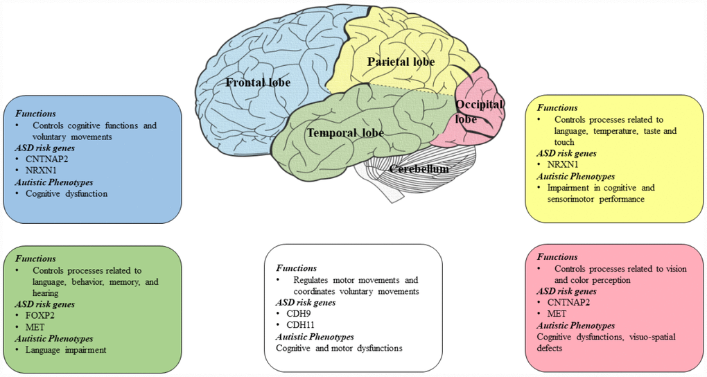 There are ASD risk genes that contribute to autistic phenotypes and are associated with different lobes of the brain (Figure 2). The frontal lobe is the largest and controls different cognitive functions such as memory, behaviors, language and voluntary movements. The parietal lobe controls sensorimotor planning, language and touch. The temporal lobe is mainly involved in controlling the semantic and recognition memory and the occipital lobe, which is the smallest lobe in the brain mainly controls visual processes [72]. One of the most important ASD risk gene is CNTNAP2 and it is found to be associated with frontal and occipital lobes of the brain [70, 73]. While NRXN1 is found to be linked with parietal and frontal lobes [74]. FOXP2 is found to be linked with temporal lobes and MET in occipital and temporal lobes [75]. Genetic findings have associated cadherins as an ASD risk gene [18, 76–78] and a recent study identified the expression of cadherins CDH9 and CDH11 in the ASD-relevant areas of the cerebellum in mice and reported high expression of these genes in segregated populations of the Purkinje cells present in the cerebellum [79].