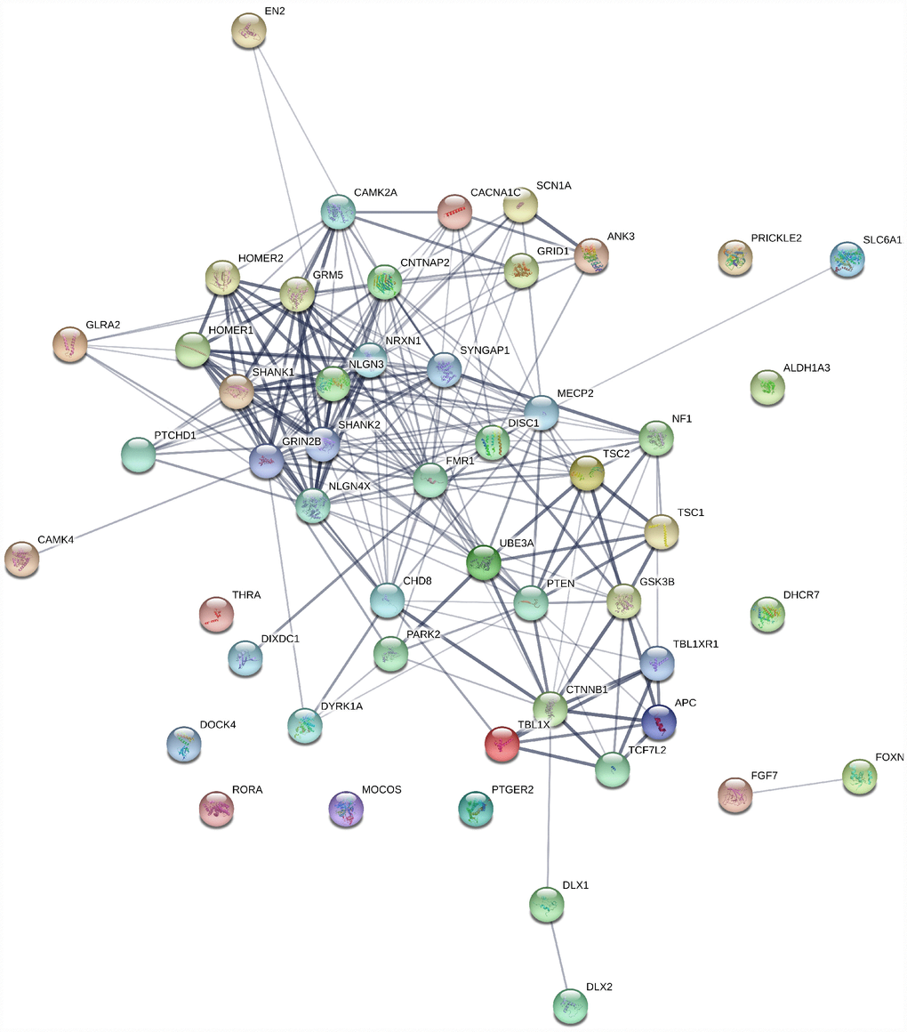 An ASD study showed the differential expression of autism candidate genes in lymphoid cell lines of autistic individuals [42]. The study reported the upregulation and increased expression of protein argininosuccinate synthetase (ASS), which acts as an important brain signaling molecule and is involved in controlling the rate-limiting step in the production of nitric oxide (NO), is associated with ASD [42]. An upregulation in the mRNA expression levels of ITGA2B encoding glycoprotein αIIβ was found in ASD affected individuals. This elevated level of expression can disrupt the cellular morphology in affected individuals [43]. Another autism study that identified abnormal brain gene expression patterns in autistic brains via whole-genome analysis of mRNA levels and CNVs reported that in young autistic individuals, the highly dysregulated pathway was the adenosine A2A receptor-signaling pathway [44]. Adenosine receptors play an important role in the development and functioning of the brain, as well as the synaptic plasticity, motor, and cognitive function and neuronal stem cell proliferation regulation [44]. Many studies have reported the association between Purkinje cells (PCs) and ASD [45–47]. Additionally, many studies have reported a significant reduction in the number of PCs in the post-mortem brains of patients who were affected with ASD [48–51]. Lower expression of neurotrophins NT3 and NT4, which play an important role in the climbing fiber system development in PCs, was also reported in affected autistic individuals [52]. Downregulation of neural and muscle specific alternative splicing regulator (A2BP1/FOX1) [53] and the MOCOS gene was also reported in ASD individuals [54]. Language and speech disorders in ASD were found to be result of mutations in the FOXP2 and CNTNAP2 genes [55]. The FOXP1 gene, which is a transcription repressor and is important for normal brain development and functioning, was found to be elevated in individuals with ASD. This indicates the involvement of FOXP1, FOXP2, and CNTNAP2 genes in the pathogenesis of ASD [56]. Synaptic components such as Nav1.2 channel, which is a voltage-gated ion channel involved in action potential propagation, neuronal pacemaking and Cav1.3 channel, which is an excitability-transcription coupling were found to be mutated in autistic patients [57]. Another ASD study showed the presence of an additional copy of 22q13/SHANK3 in a boy with Asperger syndrome that caused severe social communication impairment [58]. The SHANK3 gene is involved in the enlargement of dendritic spine heads as evidenced in mice [59]. There have also been reports of X-linked mutations in NLGN3 and NLGN4 in ASD that affect synapse formation and maintenance, which is important for speech development and social communication [58]. An ASD study that identified rare variants in mGLUR signaling pathway reported rare and deleterious variants in the SHANK3, TSC1, and TSC2 genes in non-syndromic autism individuals [60]. HOMER1, which is an autism risk gene, is considered an important component of the postsynaptic density (PSD) proteins network. This network creates a link between gene products associated with autism and neuroligins [60]. Disruption of mGluR5-Homer1 interactions can cause the development of phenotypes associated with autism [61]. Mutations in SYNGAP1, which is involved in the negative regulation of the Ras/ERK pathway and synaptic transmission, have also been identified in ASD [60]. The UBE3A and GABA receptor genes, which are expressed in the central nervous system, are located at the15q11-13 locus, and are also associated with autism [62]. O’Roak, Vives, Fu, et al. (2012) also discovered that six genes (GRIN2B, TBR1, CHD8, PTEN, TBL1XR1, and DYRK1A) contribute to 1% of ASDs and were found to be sporadic. Parikshak et al. [63] found that genes associated with autism tightly bind together in modules that are responsible for human cortical development and biological functions, including transcriptional regulation and the development of synapses.