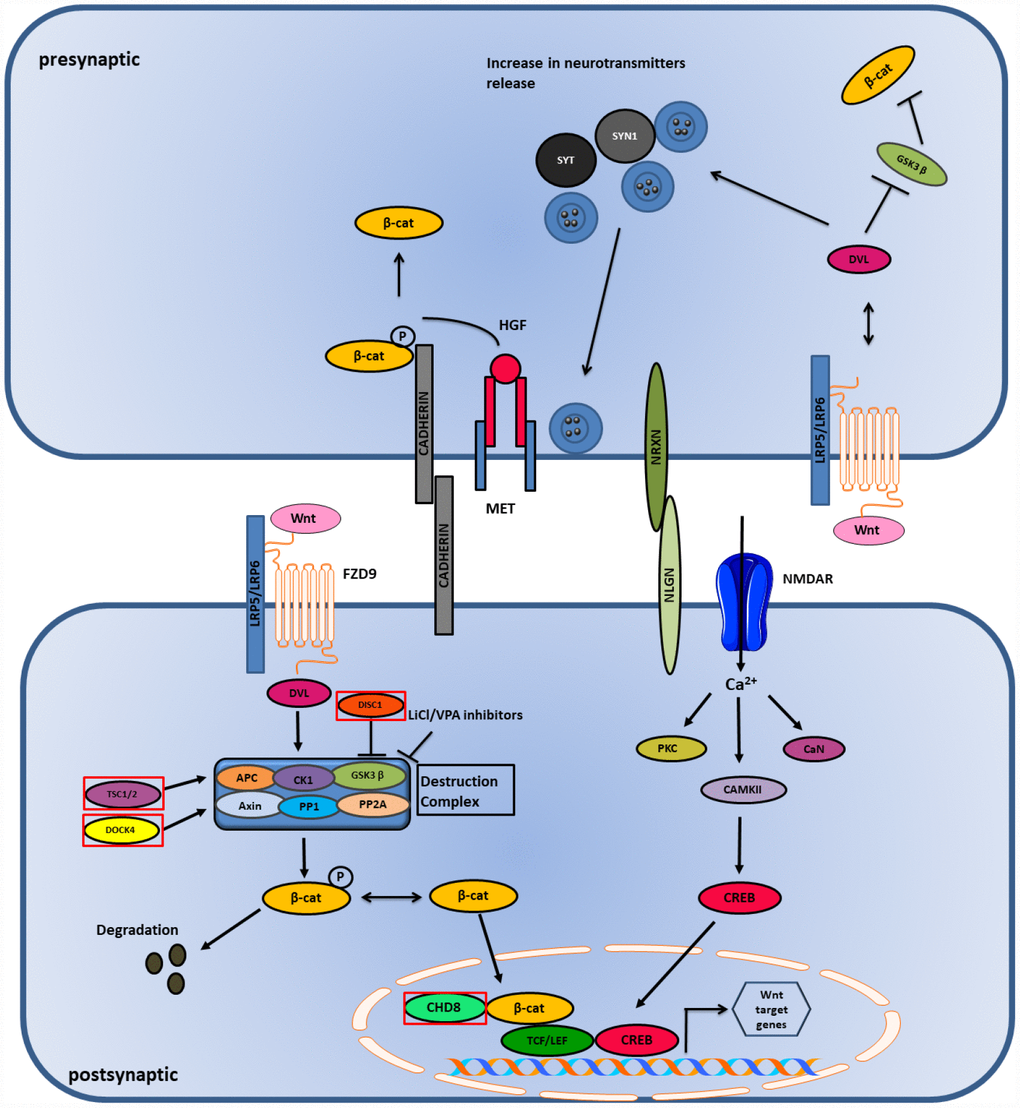 Canonical Wnt signaling or Wnt/β-catenin signaling plays an important role in the development of synapsis in the pre- and post-synaptic terminals. The release of neurotransmitters at the presynaptic terminal is triggered by the binding of Wnt ligand to a receptor that activates Dishevelled-1 (DVL1). This binds to the pre-synaptic proteins, such as Synapsin-1 (SYN1) and Synaptotagmin (SYT), that are associated with ASD and enhance the clustering of synaptic vesicles (SV’s) and release of neurotransmitters. On the other hand, cell adhesion proteins, such as cadherins and cell adhesion complexes (NLGN/NRXN), play an important role in the modulation of presynaptic terminal activity. Their interaction regulates both excitatory and inhibitory synaptic function, disrupting the E/I balance in the postsynaptic neurons. β-catenin is bound to cadherins and their interaction is essential for the recruitment of SVs to synapses. MET, a receptor for hepatocyte growth factor (HGF), is found to have a genetic link with ASD. MET phosphorylates Tyr-142 of β-catenin and promotes its dissociation from the cadherins leading to its release in the postsynaptic terminal [119] (Figure 4). Wnt/β-catenin signaling plays a significant role in ASD as it is involved in stabilizing the synaptic structure by enhancing clustering of SVs, release of neurotransmitters and modulation of cell adhesion complexes [134].
