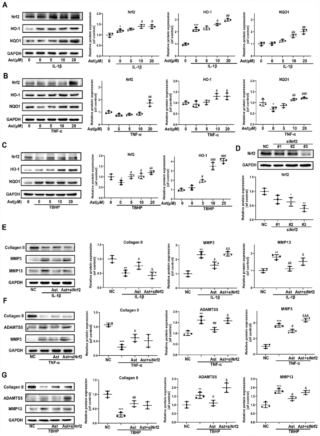 Cellular redox balance is indispensable to cartilage homeostasis. The Nrf2 anti-oxidant system acts as a master regulator of cellular redox balance. Ast exerts various cytoprotective effects by promoting Nrf2/ARE signaling [15, 24]. Therefore, we investigated whether Ast could activate the Nrf2 system in OA chondrocytes. Ast treatment led to notably increased protein levels of total Nrf2 and downstream cytoprotective genes including HO-1 and NQO1 in mouse chondrocytes stimulated with IL-1β, TNF-α, and TBHP (Figure 4A–4C). To investigate whether Nrf2 plays protective roles in cartilage homeostasis in OA chondrocytes, Nrf2 knockdown was performed by siRNA transfection (Figure 4D #3). We then examined changes in expression of ADAMTS5, MMPs, and Collagen II after cells were treated as in Figure 4E–4G. Knockdown of Nrf2 abrogated Ast-mediated inhibition of IL-1β, TNF- α, and TBHP-induced expression of ADAMTS5 and MMPs in chondrocytes. In addition, Nrf2 knockdown abolished Ast-mediated upregulation of Collagen II in IL-1β-induced chondrocytes. These data indicate that Nrf2 may at least partially protect cartilage homeostasis against damage due to IL-1β, TNF-α and TBHP.