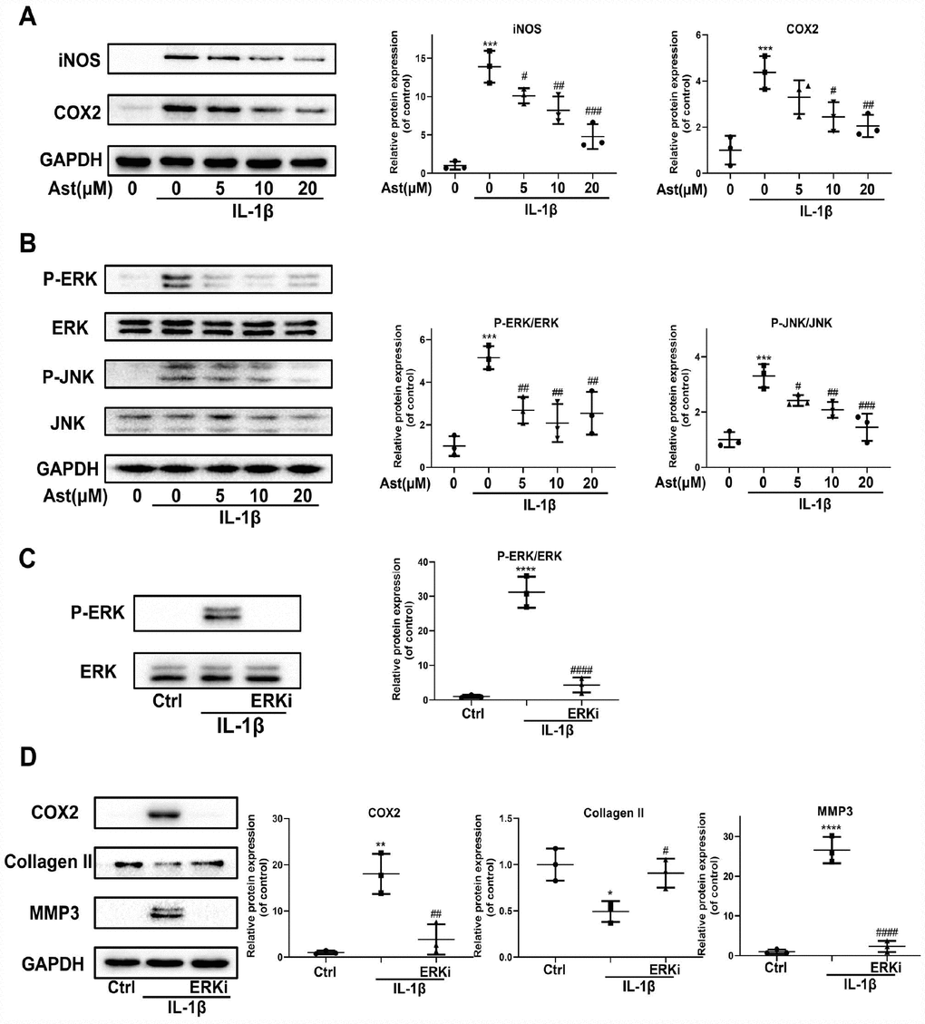 Our results showed that Ast reduced IL-1β-induced upregulation of iNOS and COX2 protein levels (Figure 5A). In addition, Ast blocked IL-1β-induced phosphorylation of ERK and JNK (Figure 5B). We hypothesized that the MAPK signaling pathway may be involved in Ast-mediated suppression of IL-1β-induced inflammation, and in ECM degradation. Our data showed that an ERK inhibitor can reverse IL-1β-induced phosphorylation of ERK, and can further inhibit the increased expression of COX2 and MMP3, and decreased expression of Collagen II, similar to the effects of Ast treatment (Figure 5C, 5D). These results indirectly demonstrate that Ast can modulate the IL-1β-induced inflammatory response, and cartilage homeostasis via the MAPK signaling pathway.