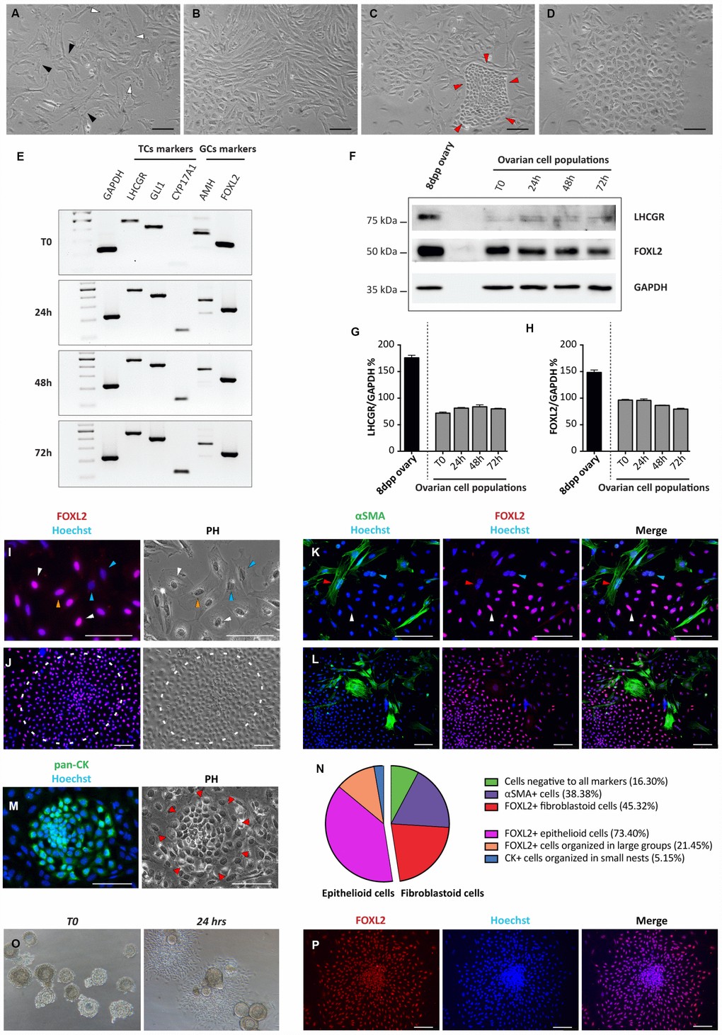 Cells were analyzed by RT-PCR, WB, IHC and IF, at different culture times (between day 1 and day 4) for the expression of markers of epithelial, granulosa (GCs) and follicular theca (TCs) cells (pan-CKs; AMH and FOXL2; Gli1, LHCGR, CYP17A1 and αSMA, respectively).