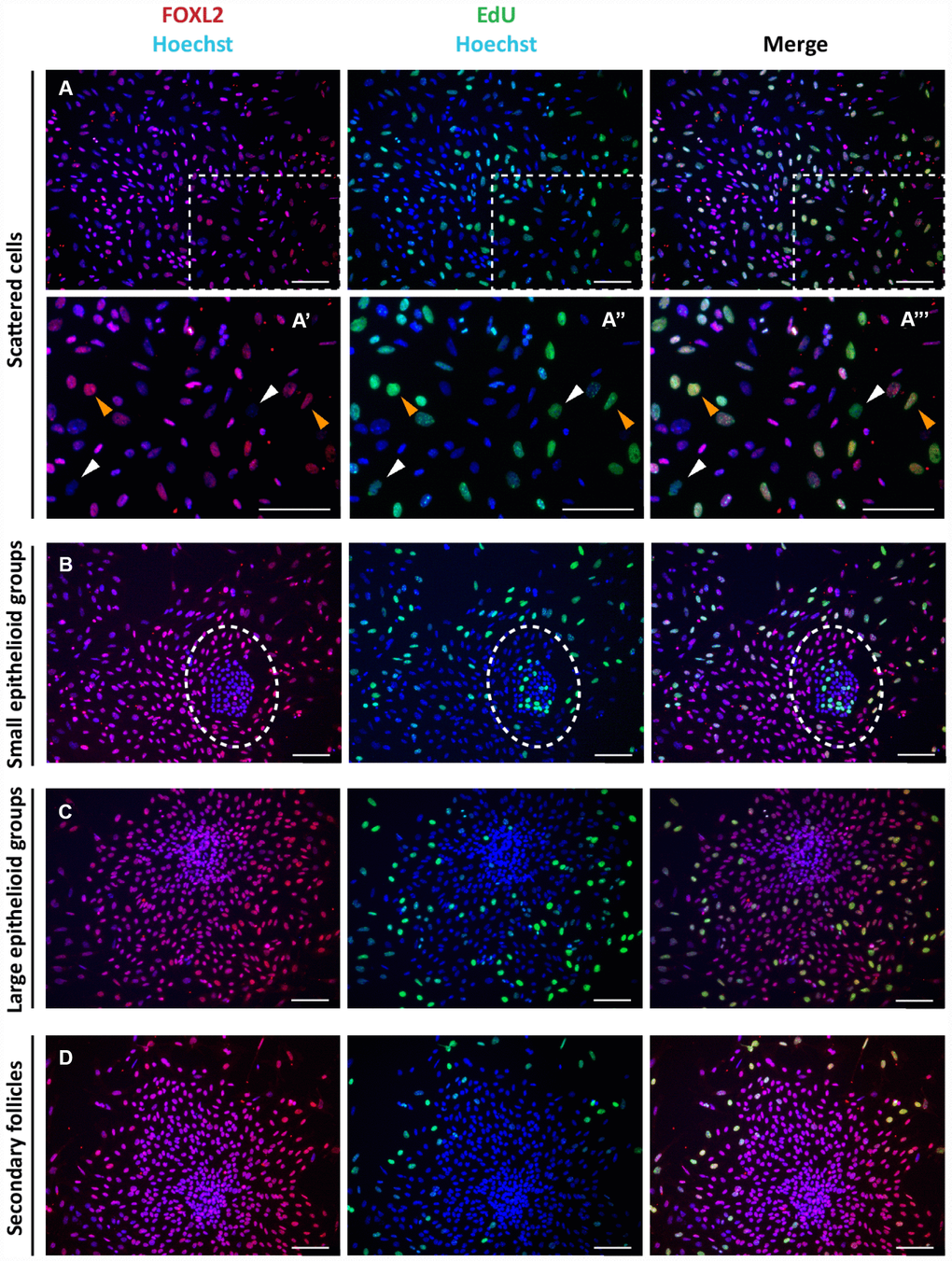 The Click-iT EdU proliferation assay performed on the cultured cells indicated that for the most part, the scattered putative pGCs, pTCs and OSE cells in colonies were proliferating, whilst GCs in large colonies and spreading out from secondary follicles were not (Figure 2).