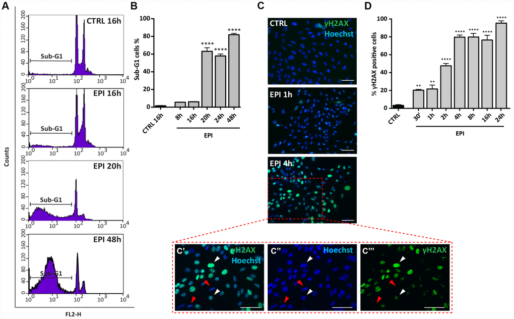 In situ IF for the phosphorylated form of H2AX (γH2AX), a marker of DNA damage, showed that EPI caused a progressive rapid increase of the positive cells number, reaching 80% after 4 hrs of culture (CTRL = 3.3 ± 0.9% vs EPI 4h = 79.7 ± 2.4%) and maintained up to 95.33 ± 2.60% after 24 hrs (Figure 3C, 3D). These last results were confirmed by WB analyses (Supplementary Figure 2).