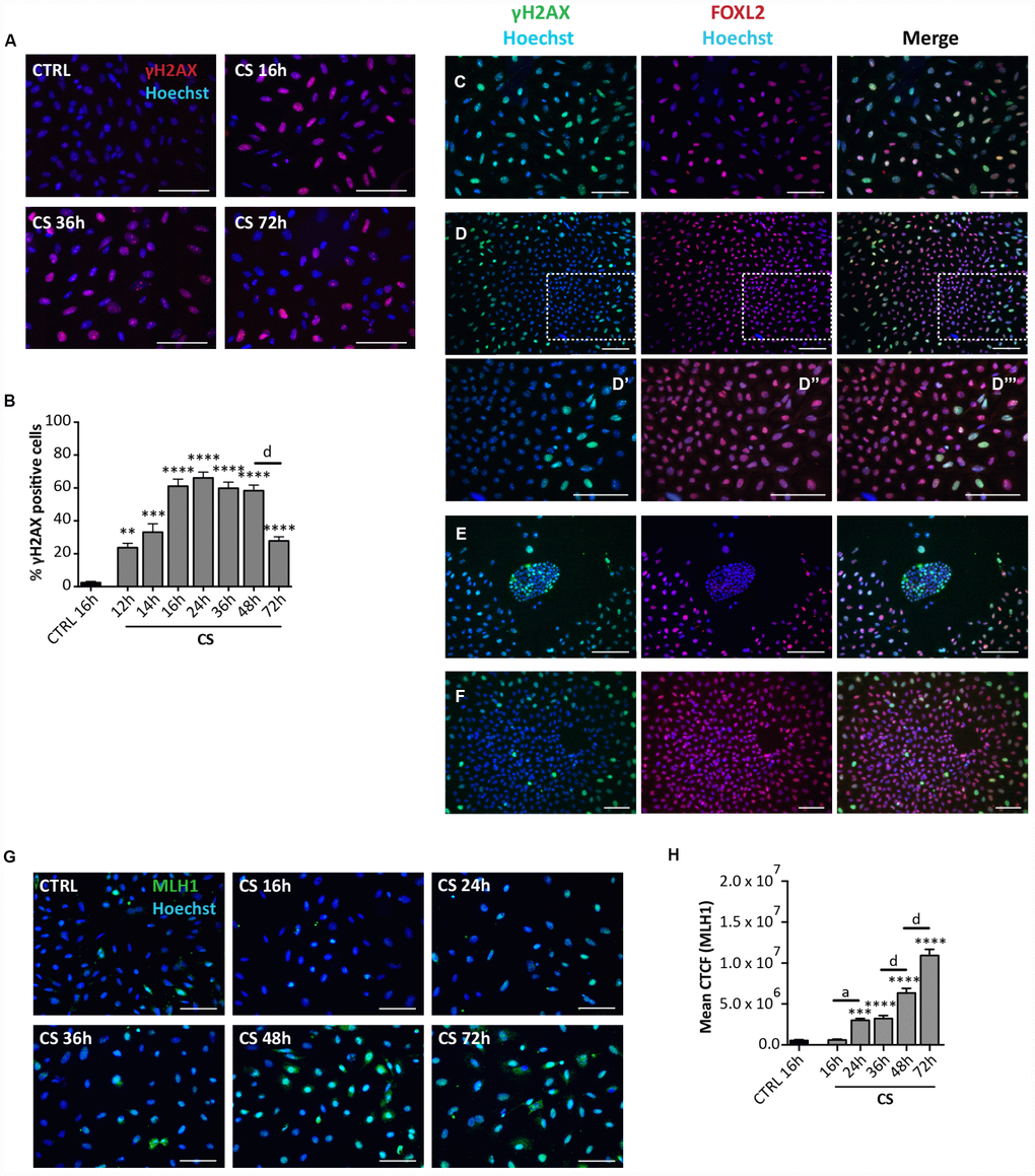 Since SIPS usually takes place following the activation of the DNA damage response (DDR) pathways, we next investigate the incidence of DNA damage in the cultured cells. IF staining for γH2AX showed a progressive increase of the number of positive cells up to about 60% of the total cells at 16 hrs (60.95 ± 4.22%) and 48 hrs (58.21 ± 3.31%) from the CS exposure followed by a rapid decrease to 27.73 ± 2.37% at 72 hrs (Figure 5A, 5B). It is likely that such a decrease testifies ongoing DNA repair since not increased apoptotic level was detected at this time (see the results above). The changes of γH2AX amount in the cultured cells detected by WB follow a similar pattern (Supplementary Figure 3A, 3B). The in situ staining pattern of MLH1 (a protein involved in the DNA mismatch repair system (MMR), showing the most part of cells positive and a progressive increase of staining intensity up to 72 hrs (Figure 5G, 5H), on one side confirmed the kinetics of DNA repair reported above for γH2AX and the other suggested the involved of MMR pathways in this process. Cells stained with antibodies against RAD51 and ERCC1 implicated in homologous recombination (HR) and nucleotide excision repair (NER), respectively, showed a generalized constant low/average positivity throughout the tested period that did not allowed any certain conclusion (Supplementary Figure 4A, 4B).