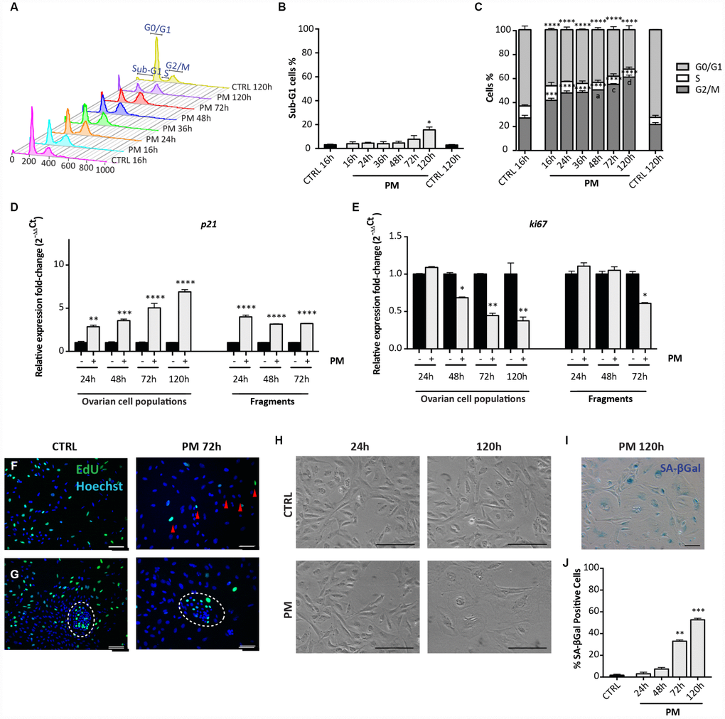 Observations under the PH microscope showed that, between 48 and 72 hrs of CS treatment, 60%–70% of the putative pGCs and pTCs acquired a large and flattened morphology, typical of stress-induced premature senescent (SIPS) cells (Figure 4H). Such morphological change was not evident in the putative GCs and OSE cells, these latter colonies showing appreciable size increase (not shown).