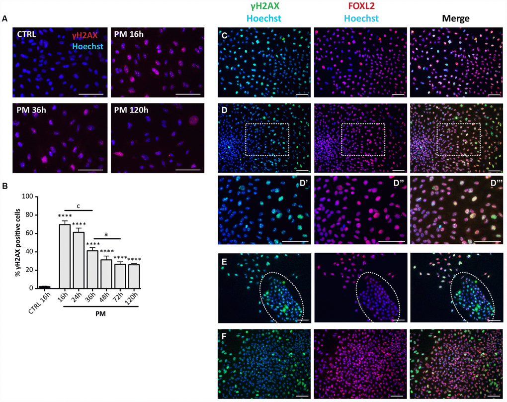 For immunohistochemistry (IHC) and immunofluorescence (IF) on cultured cells, medium was removed and, after two-three washes in PBS, cells were fixed with 4% paraformaldehyde (PFA) for 15 min at room temperature. For IF analysis on ovarian sections, ovaries were collected and fixed in 4% PFA for 4h. After dehydration, tissues were embedded in paraffin and sectioned (5 μm sections) following standard procedures. After deparaffinization and hydration, antigen retrieval in citrate buffer (pH 6) was performed. Both cultured cells and ovarian sections were permeabilized with 0.1% Triton X in PBS for 10 min, blocked in 3% BSA for 30 min and then incubated with primary antibodies O.N. at 4°C: FOXL2 (1:200); αSMA (1:300); pan-CK (1:250); γH2AX (1:500); RAD51 (1:100); MLH1 (1:100); ERCC1 (1:100). Primary antibody binding was detected using fluorescent-dye conjugated secondary antibody (1 hr at room temperature). Hoechst was used as counterstain. Both cells and sections were mounted in PBS-glycerol (1:1) and analyzed by Leica DMI6000B microscope. For quantification of different cell populations in culture, at least 150 cells within randomly selected field were scored for a total of 500 cells in each separate experiment. For γH2AX staining, cells were considered positive if they displayed >4 nuclear dots or a fully stained nucleus [39, 40]; for each condition, at least 300 cells were scored in each separate experiment. For fluorescence intensity analysis, at least 300 cells were analyzed in each separate experiment using ImageJ software. The Correlated Total Cell Fluorescence (CTCF) for each cell was calculated using the following equation: CTCF = Integrated Density of selected cell – (Area of selected cell * Mean fluorescence of background readings). Data obtained were represented in figure as average of all cells analyzed.