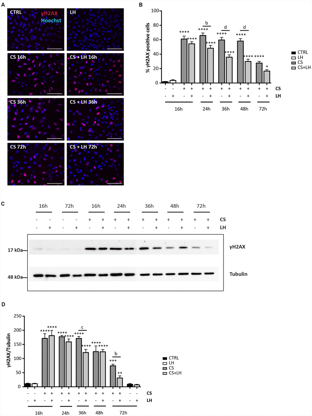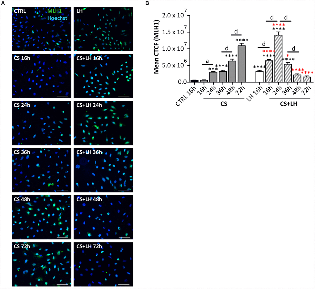 The results in Supplementary Figures 6 and 7 shown that LH was unable to counteract the DNA damages induced by EPI (Supplementary Figure 6A–6D) and the occurrence of all stress-induced processes caused by CS in the ovarian somatic cells (Supplementary Figure 7A–7H). Moreover, LH did not have a detectable effect on the initial DNA damage caused by CS measurable by γH2AX staining. However, the hormone appeared to significantly accelerate the kinetics of DNA repair occurring in CS-treated cells evaluated both by γH2AX (Figure 8A–8D) and MLH1 (Figure 9A, 9B) staining whereas it did not impinge upon the RAD51 and ERCC1 staining (Supplementary Figure 8A, 8B).