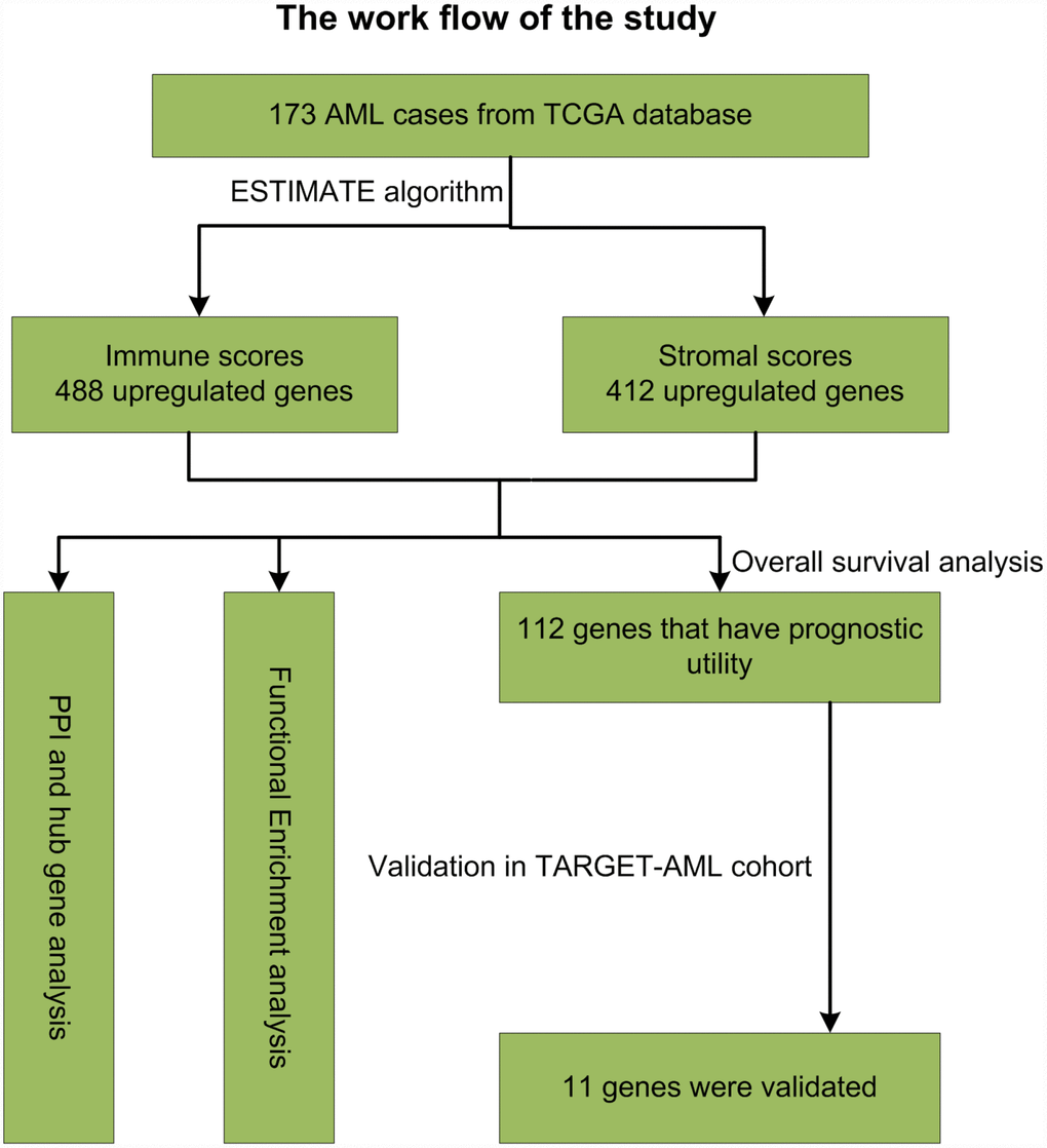 The TME plays an essential role in the development, progression, and relapse of AML. Therefore, targeting the TME has become an effective tool to improve patient outcomes [2]. The main purpose of this study was to identify on the TCGA database TME genes that contribute to overall survival in AML patients. Following the general analysis workflow diagrammed in Figure 10, analysis of 173 AML cases identified 549 DEGs between high and low immune score patients, while 427 DEGs distinguished cases with high vs low AML stromal scores. We also detected an association between immune scores and diverse AML clinical parameters, including cytogenetic risk categories, older age, morphological FAB subtypes, and patient outcomes. Thus, we show that prognosis is worse for patients with a high immune score, while longer overall survival is predicted for cases with lower cytogenetic risk, no history of chemotherapy, FAB M3 subtype, or patients with age greater older than 60 years. These results were consistent with previous studies [34]. Further classification of cases revealed 361 common DEGs between high vs low immune/stromal score patients. GO analysis of these DEGs revealed significant enrichment in immune-related processes known to contribute to disease progression and drug resistance in several tumors [34, 35], including lung cancer [36], breast cancer [37] and bladder cancer [38]. Accordingly, KEGG analysis suggested the involvement of DEGs in several signaling pathways including ‘chemokine signaling pathway’ [39] and ‘intestinal immune network for IgA production’ [40], which may influence TME dynamics and development of AML. On the other hand, signal transduction pathways involving ‘cytokine-cytokine receptor interaction’ contribute to the progression of glioblastoma [41] and osteosarcoma [42], and modulate the microenvironment of hematopoietic tumors.