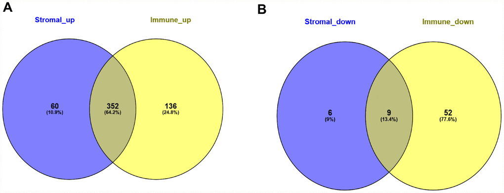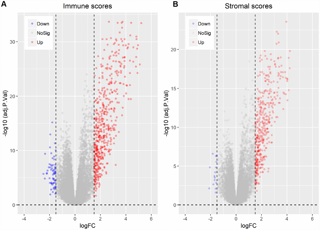 Differentially expressed genes (DEGs) were identified between high and low score groups stratified by the median value of immune scores and stromal scores using limma package [80]. Genes with |log FC |> 1.5 and adjusted p-value (q value) < 0.05 were selected as DEGs.