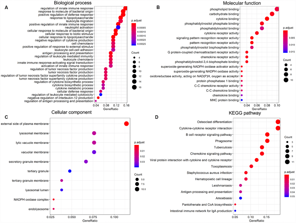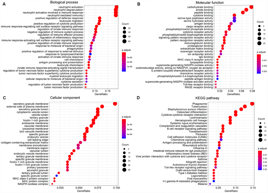 To investigate the potential function of the DEGs identified above, GO term and KEGG pathway enrichment analyses were performed using the clusterProfiler package. Significance (false discovery rate < 0.05) was achieved for a total of 531 GO terms of biological process, 64 GO terms of molecular function, and 61 GO terms of cellular component. The top 30 GO biological process terms indicated that the DEGs were primarily enriched in ‘regulation of immune response process’, ‘activity of neutrophils and leukocytes’, ‘cytokine secretion’, ‘inflammatory response’, and ‘regulation of tumor necrosis’ (Figure 5A). Molecular functions ascribed to these DEGs included mainly ‘peptide binding’, ‘cytokine binding’, ‘immunoglobulin binding’, ‘lipopeptide binding’, and several sub-terms of ‘cargo receptor activity’ (Figure 5B). Primary terms within cellular component included ‘secretory granule membrane’ and ‘secretory granule lumen’, and ‘vesicle lumen’ (Figure 5C). Additionally, on KEGG analysis the DEGs were mainly enriched in ‘infection’, ‘hematopoietic cell lineage’, ‘B cell receptor signaling’ and ‘chemokine signaling’ pathways (Figure 5D). These analyses suggest a vital role for these DEGs in AML development, and merit further investigation to define their true biological contribution.