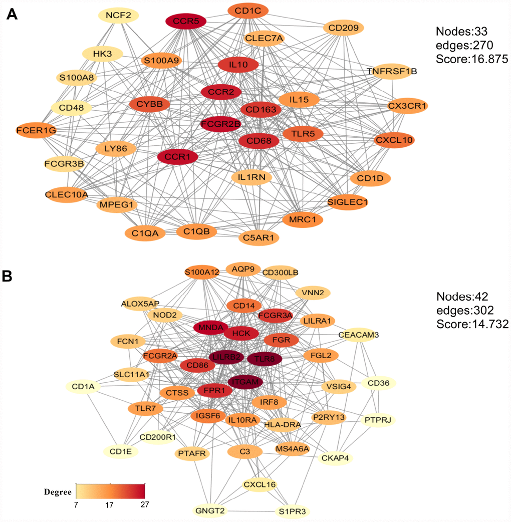 To analyze potential connectivity patterns between the transcripts of our DEG set, a protein-protein interaction (PPI) network was constructed using the STRING database. The network revealed two significant modules (Figure 6). We called these modules CCR5 (chemokine receptor 5) and ITGAM (integrin alpha M), in reference to the highest-degree genes within each module. The CCR5 module (Figure 6A) was defined by 270 edges involving 33 nodes. CCR5, CCR1, FCGR2B, CCR2, CD68, CD163, and IL10 were the top 20% degree ranked nodes. Meanwhile, in the ITGAM module (Figure 6B), ITGAM, TLR8, LILRB2, MNDA, HCK, FPR1, CD86, and FCGR3A were the nodes with highest connectivity. After loading the entire PPI network on Cytoscape, the top 20 high-degree hub genes were identified using the cytoHubba plugin (Supplementary Table 1). These included all the top proteins identified in the CCR5 and ITGAM modules. Of note, most of these key nodes consisted of proteins/genes involved in immune regulation.