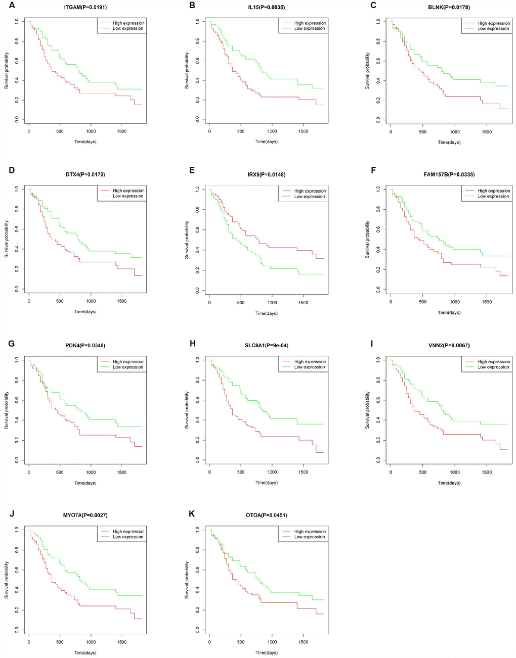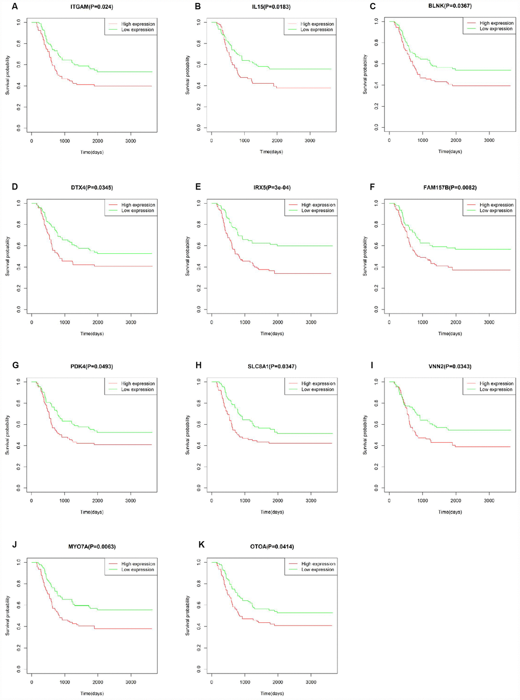 To verify whether the genes identified from TCGA AML patients are also of prognostic significance in an independent AML cohort, we downloaded and analyzed gene expression data of 187 TARGET AML patients from UCSC Xena database. Among 112 prognostic genes, a total of 11 genes were validated based on significant association with poor overall survival (Figure 9). Except for IRX5, the expression of all these validated genes showed a positive correlation with CXCR4 expression (Supplementary Figure 3), while ITGAM and SLC8A1 were negatively correlated with E-selectin and VLA-4 (Supplementary Figure 4). Similarly, a negative correlation between MYOTA and OTOA expression and E-selectin and VLA-4 expression was observed.