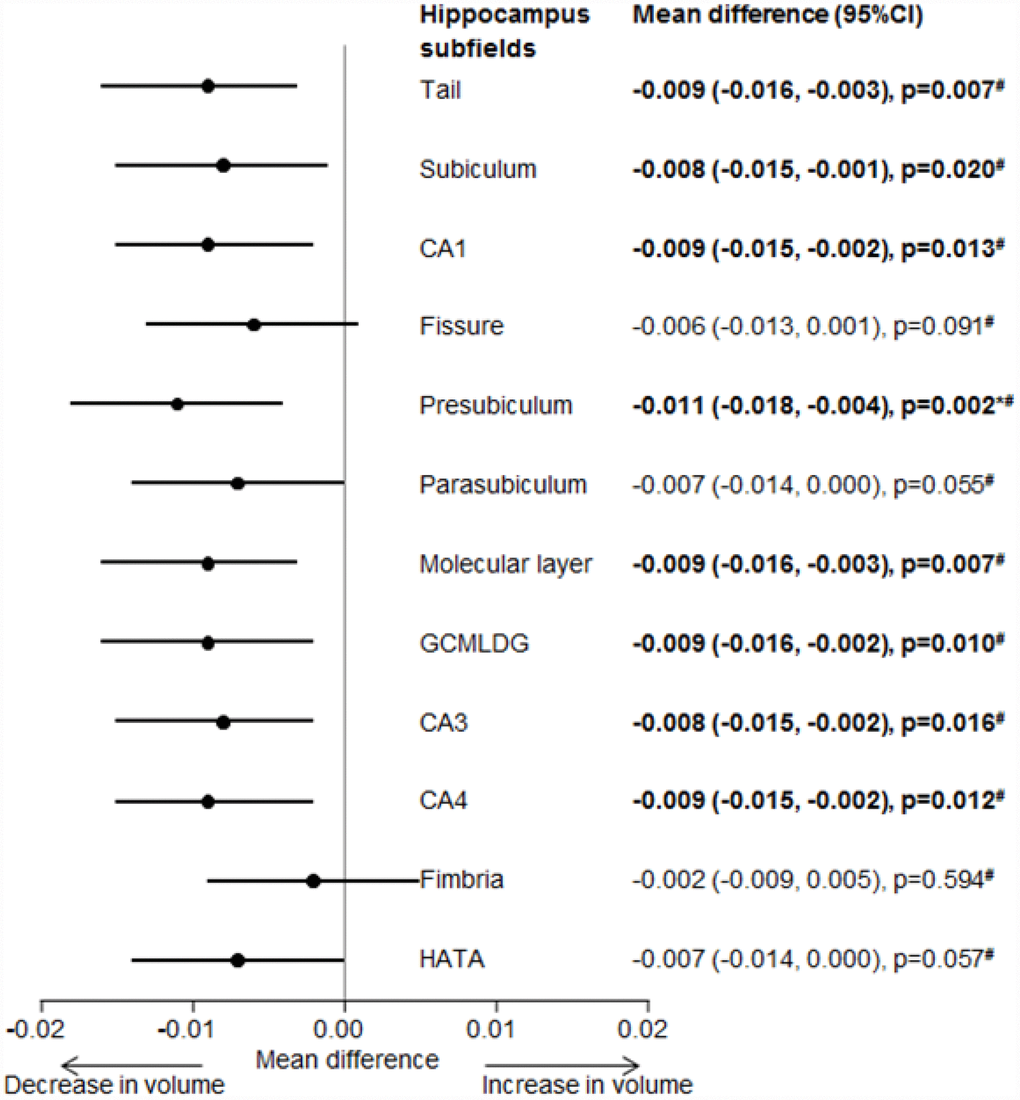 Figure 1 shows the association between mixed-location CMBs and hippocampus subfield volumes. Mixed-location CMBs were associated with smaller volumes of hippocampus tail, subiculum, CA1, presubiculum, molecular layer, GCMLDG, CA3 and CA4 (p<0.05). No significant association was found between strictly lobar and strictly deep CMBs with hippocampus subfield volumes [data not shown]. When treating location of CMBs as categorical data (presence vs absence) no significant association was again found between presence of strictly lobar, strictly deep and mixed-location CMBs with hippocampus subfield volumes [data not shown].