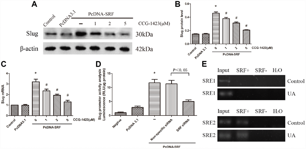 An experiment combining SRF overexpression and inhibition was carried out. Figure 4A–4C indicated that CCG-1423 dramatically suppressed the slug expression induced by SRF overexpression by a dose-dependent manner, suggesting that the suppression of SRF through CCG-1423 was able to abolish a critical transcription factor that regulates EMT under various conditions.