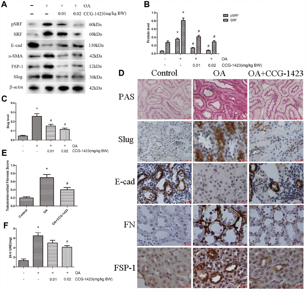 As shown in Table 1, the establishment of an HN model was verified by the results of biochemical analysis, which showed merely the serum albumin level was ameliorated in CCG-1423-treated HN rats as well. As shown in Figure 5A–5D, the suppression of SRF by CCG-1423 dramatically blocked the upregulation in FN, FSP-1, α-SMA, SRF, slug and the downregulation in E-cadherin of renal medulla tissue samples. PAS staining demonstrated there were renal tubulointerstitial fibrosis in the OA group, and tubulointerstitial fibrosis was significantly improved after CCG-1423 treatment for 6 weeks in the OA+CCG group compared with the OA group (Figure 5D and 5E). What is more, CCG-1423 improved albuminuria by a dose-dependent manner (Figure 5F). Compared with the vehicle control, 24-h UAE was significantly reduced by CCG-1423 at a dose of 0.02 mg/kg of BW in approximately 30%. Those findings suggested targeting SRF with a small molecular suppressor was able to ameliorate TEC EMT, renal tubulointerstitial fibrosis and albuminuria.