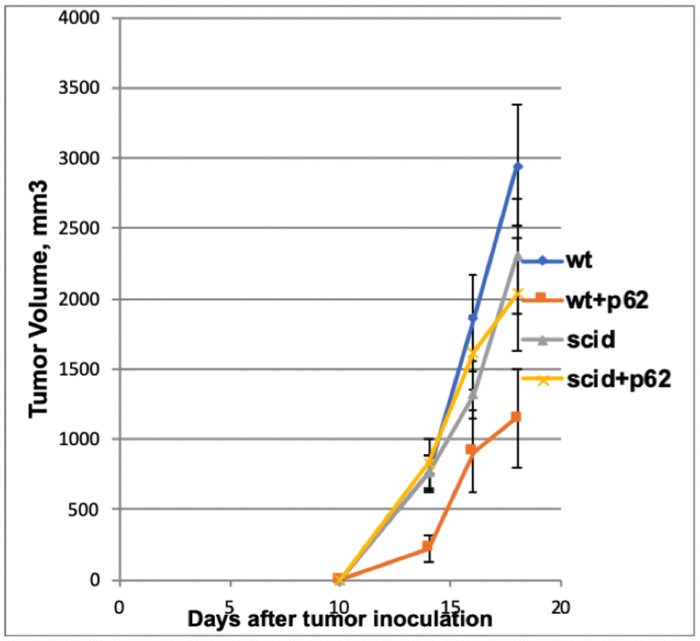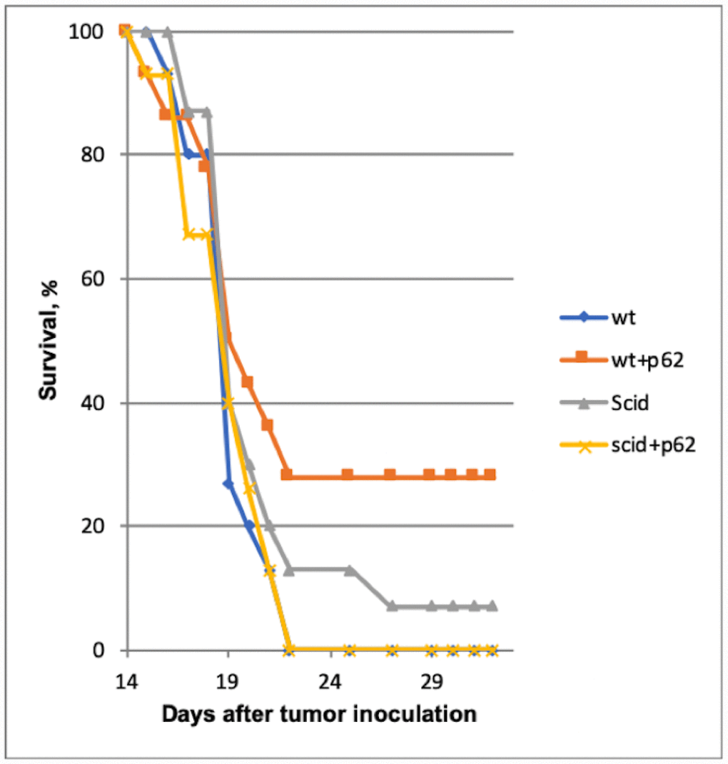 To establish whether the p62 plasmid indeed acts via an anti-tumor adaptive immune response, we compared the anti-tumor effect of the p62 plasmid in wt and SCID mice strains. Indeed, if the plasmid acts on the cancer cells directly and/or via a mechanism other than an adaptive immune response then the B16 melanoma administered to the two strains would demonstrate the same sensitivity to the plasmid. In contrast, if the plasmid acts via stimulating/modulating an adaptive immune response, it would be inactive in SCID mice lacking the lymphocytes. The later turned out to be the case. Although p62 DNA has reduced the growth of the subcutaneous B16 melanoma tumor and increased the rate of survival in the wt animals, the plasmid was completely inactive in SCID mice. Thus, we conclude that p62 DNA acts via adaptive immune system.