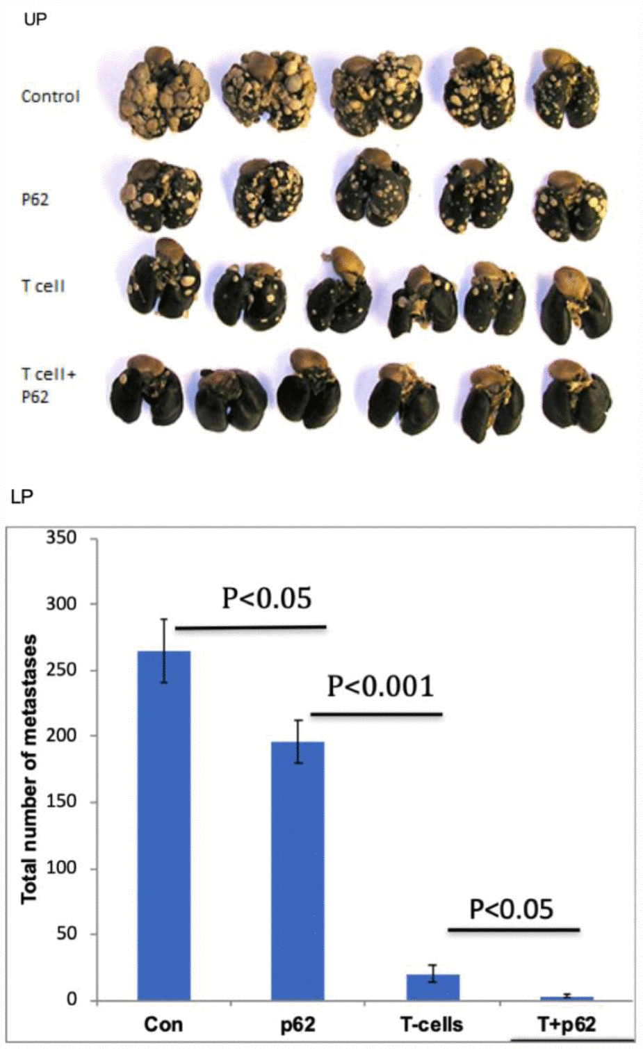 The above presented data made two option equally plausible. The first hypothesis would state that p62 plasmid induce the re-organization of the tumor stroma, and this change(s) is sufficient for the antitumor effect of the plasmid. An alternative hypothesis would state that p62 plasmid acts primarly via adaptive immunity. If the first hypothesis is correct, the antitumor effects would be the same both in wild-type mice or in syngeneic mice with severe combined immunodeficiency (SCID) SCID mice have a genetically inactivated adaptive immune system (i.e. lacking T-and B-cells), but maintain an intact innate immune system (i.e., macrophages, NK cells etc). As depicted in Figure 4, when SCID mice were challenged with B16 melanoma cells, they developed tumors similar to control (wt) mice, indicating that the lack of an adaptive immune system does not promote tumor development in this model. However, in contrast to wt mice, the p62 plasmid lost its ability to inhibit tumor growth in SCID animals (Figure 4). Furthermore, whereas p62 DNA increased survival in wt mice, no such effect was seen in SCID mice (Figure 5). Thus, we conclude that an adaptive immune system is required for the anti-cancer of the p62 plasmid. Finally to test if the p62DNA can enhance the effects of other immunotherapies, we employed a model of adaptive cell transfer, where T-cells from tumor-bearing mice are transferred to animals with established tumor (or metastasis). In this model, the p62 plasmid was administered on days 9 and 14 after the animals received the transplantable tumor, one week before the mice were sacrificed. The days of plasmid administration left us time period to short to develop a protective anti-p62 immunity which could block / reduce the formation of lung metastasis. As shown in Figure 6, while p62DNA alone shows only a minor effect on lung metastasis, it amplified the anti-metastatic effects of transferred T-cells.