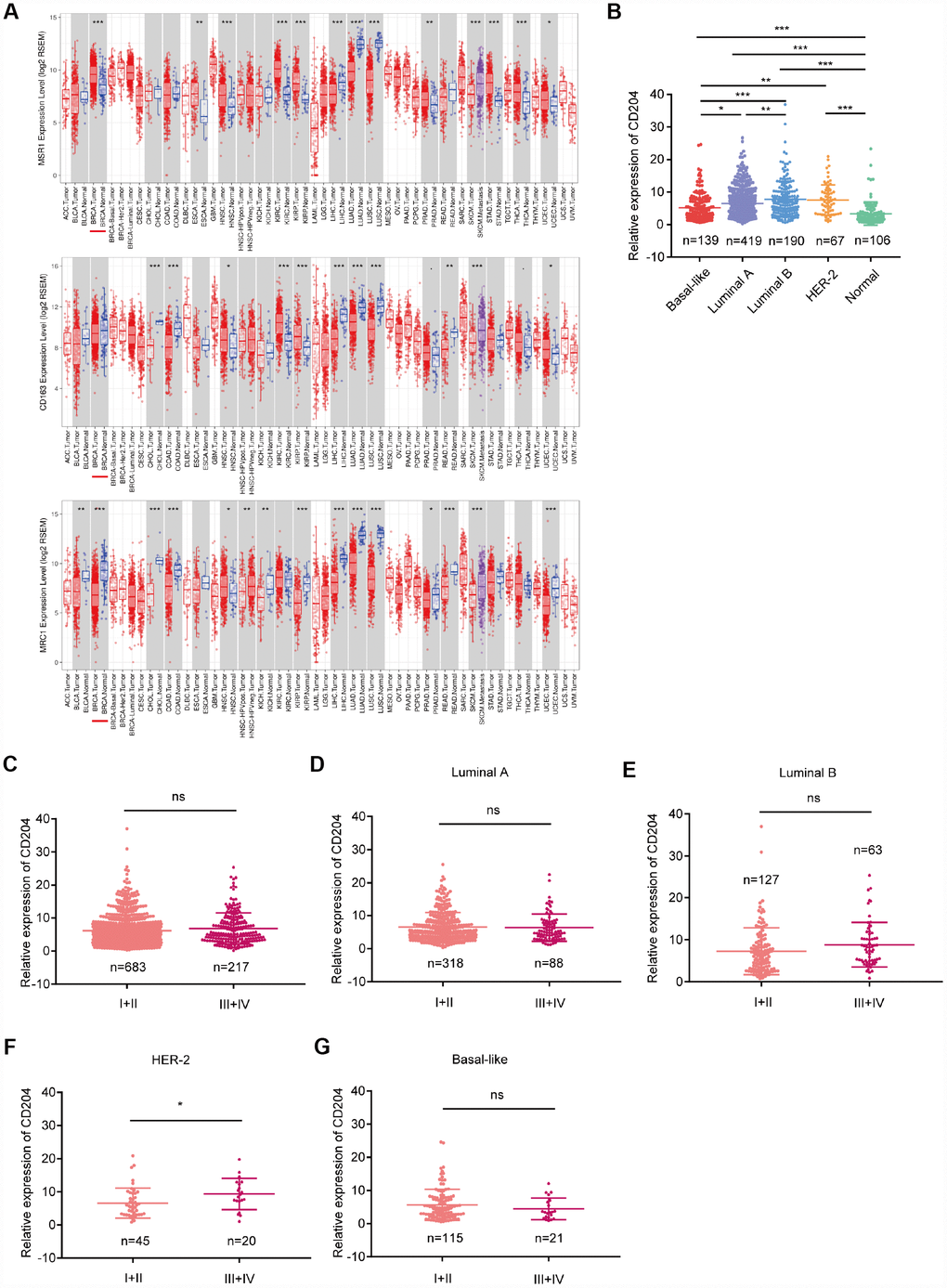 CD68, a pan-macrophage marker, is most extensively used to detect TAMs; however, the expression of CD68 in cancer and stromal cells was found. Therefore, the use of this marker to identify TAMs necessitates carefully evaluation [23]. Recently, CD163, CD204 (MSR1), and CD206 (MRC1) have been used to detect TAMs in mouse models [22]. To determine how these markers are expressed in tumors in comparison with normal tissue, the mRNA levels were analyzed using TCGA database. Compared with normal tissue, only CD204 was to be upregulated in breast cancer tissue (Figure 1A), suggesting its important role. Thus, we selected CD204 for further investigation. Different CD204 expression conditions among subtypes were also identified (Figure 1B). However, we did not find any differences in the CD204 expression levels among samples obtained from patients with clinical stage I-II and III-IV breast cancer (Figure 1C). We further analyzed the CD204 expression levels in each subtype at different clinical stages. Only in the HER-2-enriched subtype, CD204 expression was higher in stage III-IV than in stage I-II (Figure 1D–1G), further suggesting the diverse roles of CD204 in different breast cancer subtypes.