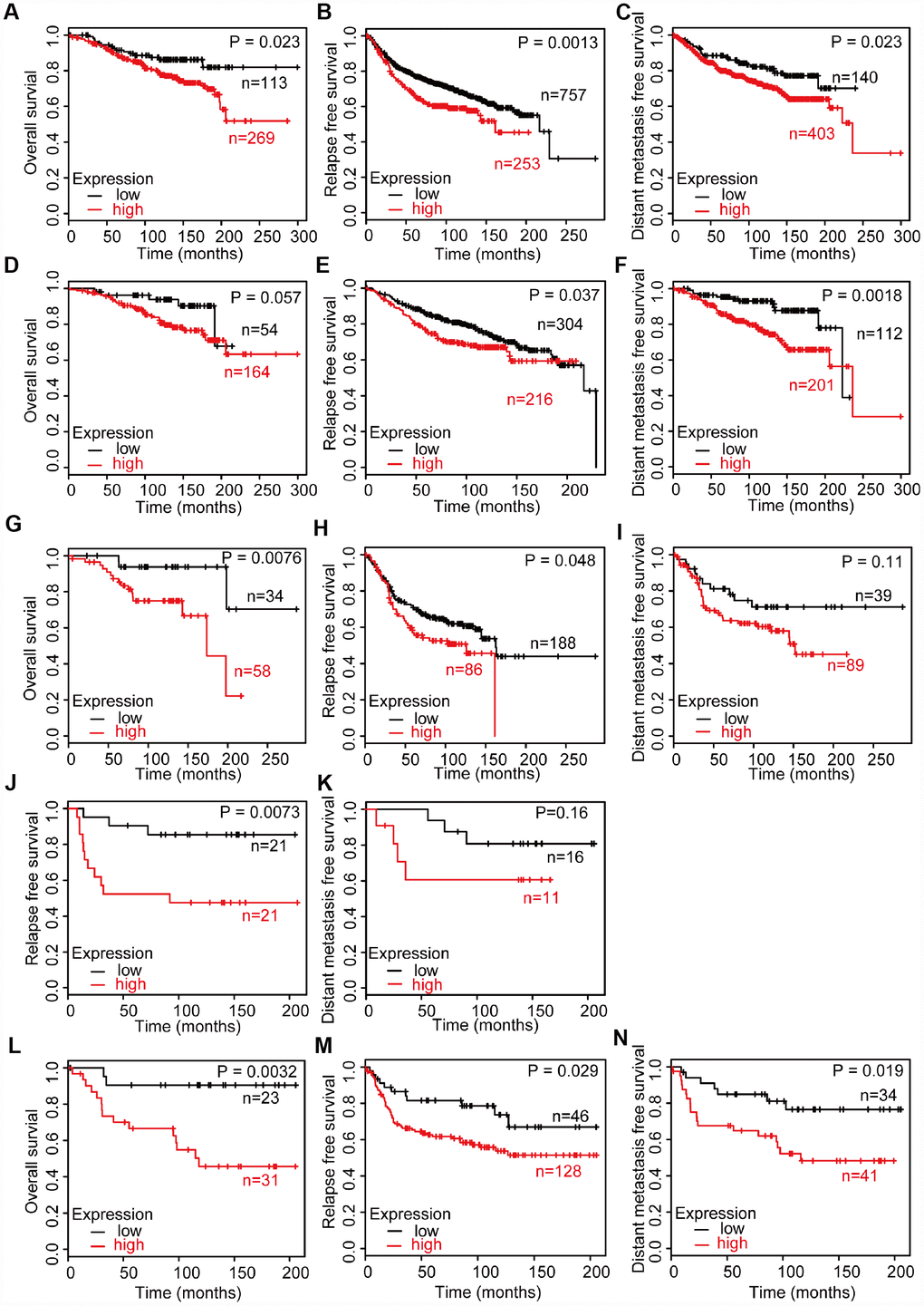 Then, we investigated the prognosis according to the CD204 expression levels among all untreated breast cancers and the four molecular subtypes using GEO datasets. GEO datasets contain a larger sample size (patient total number, 3951) than the TCGA database (patient total number, 815) and own systemically untreated patients’ cohorts that are appropriate for the clinical outcome analysis of TAM-related markers [22, 24]. Because macrophages influence the prognosis of breast cancer after chemotherapy and other treatment, overall survival (OS), relapse free survival (RFS), and distant metastasis survival (DMFS) were analyzed. Among all breast cancers, patients with lower CD204 expression levels have better OS, RFS, and DMFS (Figure 2A–2C). Better OS, RFS, and DMFS were also found in lower CD204 expression group among the luminal A subtype (Figure 2D–2F). Subsequently, better OS and RFS were shown in luminal B patients with lower CD204 expression levels (Figure 2G, 2H). In the HER2-enriched subtype, better OS was found in lower CD204 expression group (Figure 2J) and better OS, RFS, and DMFS were shown in basal-like subtype with a lower CD204 expression level (Figure 2L–2N). In addition, there was no significant difference in DMFS between higher and lower CD204 expression groups in luminal B and HER2-amplified subtype (Figure 2I, 2K), which may partly be the result of the smaller sample size. OS analysis of HER2-amplified subtype was not performed owing to the low number of cases. Potential results of better DMFS in luminal B and HER2-amplified subtype with a lower CD204 expression level were observed. Generally, high CD204 expression levels in all subtypes demonstrated poor clinical outcomes in patients with breast cancer.