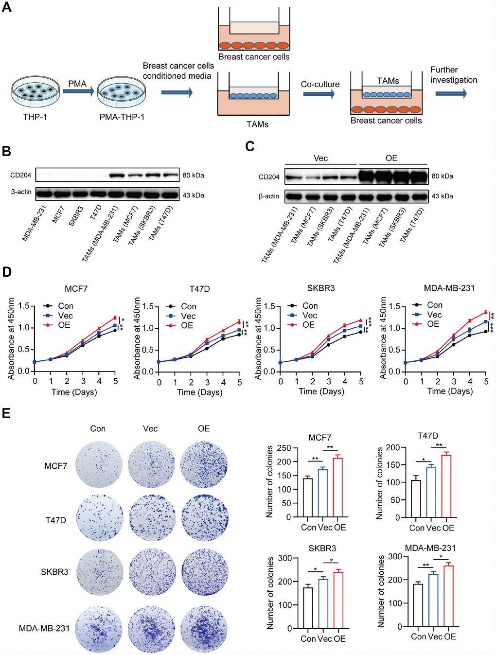 To investigate the roles CD204 play in the regulation of tumor cell proliferation, we utilized an in vitro model of TAMs (Figure 3A). The human monocyte cell line THP-1 was induced into macrophages by treatment with PMA for 24 h and then cultured with conditioned media from four different breast cancer cell lines (MCF7, T47D, SKBR3, and MDA-MB-231). Based on the previous literature, the luminal A subtype comprised MCF7 cells, the luminal B subtype comprised T47D cells, the HER-2-enriched subtype comprised SKBR3 cells, and the basal-like subtype comprised MDA-MB-231 cells [25]. We found that CD204 was only expressed in TAMs rather than breast cancer cells (Figure 3B). Next, we successfully increased the CD204 expression level in TAMs and defined these as CD204+ TAMs (Figure 3C). Moreover, CD204+ TAMs could promote proliferation of cells of all subtypes of breast cancer, as assessed by CCK-8 and colony formation assays (Figure 3D and 3E).