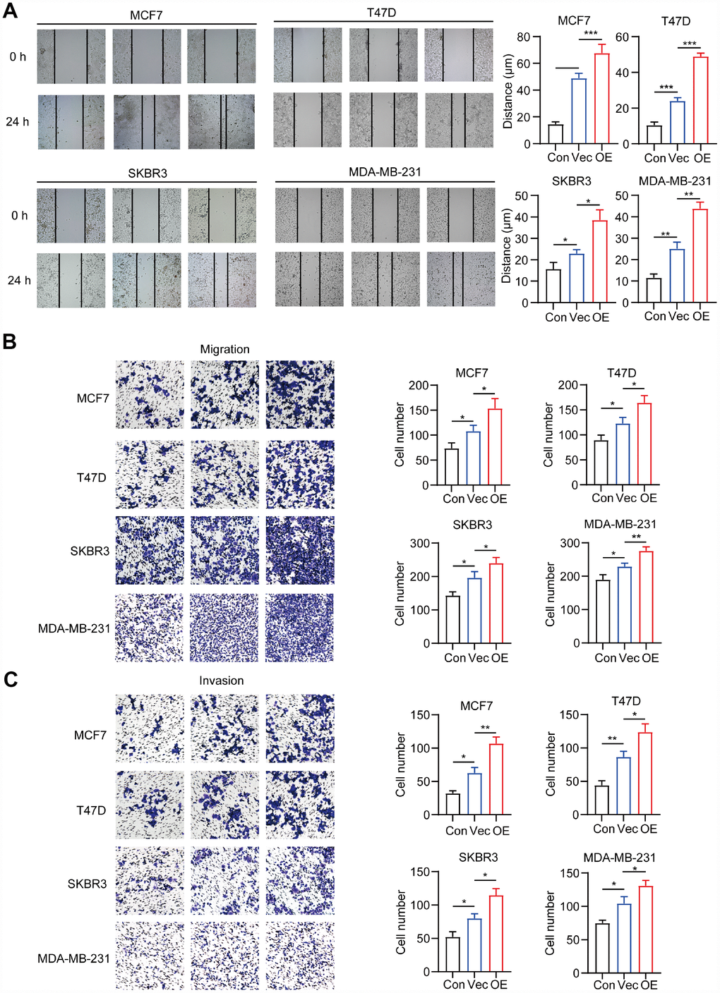 In the migration assay, 5 × 104 cells were seeded into the upper chamber of the transwell plate (Millipore, La Jolla, CA, USA). The cell invasion assay was performed using Matrigel-coated filters (BD, La Jolla, CA, USA). Specific culture medium was added to the bottom chamber. As previously described, BC cells were allowed to migrate for 24 h or invade through the Matrigel for 48 h [60]. The migrated or invaded cells were then fixed and stained with 0.1% crystal violet, six randomly selected fields were photographed, and the cell numbers were counted.