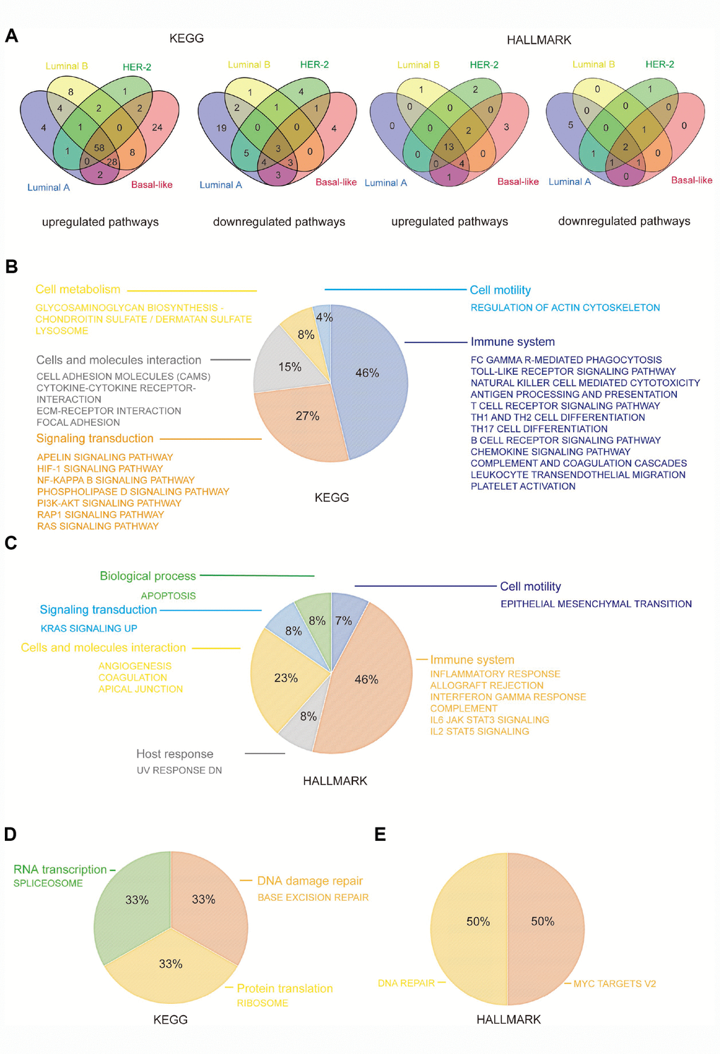 To further explore the mechanism involved in the promotion of breast cancer by CD204, we performed GSEA to identify the KEGG (Kyoto Encyclopedia of Genes and Genomes) and HALLMARK pathways with which significantly upregulated or downregulated gene sets correspond. Among the KEGG pathways, we found that the four subtypes had 58 upregulated gene sets and three downregulated gene sets in common. Among the HALLMARK pathways, we identified 13 upregulated gene sets and 2 downregulated gene sets shared by the four subtypes (Figure 5A).