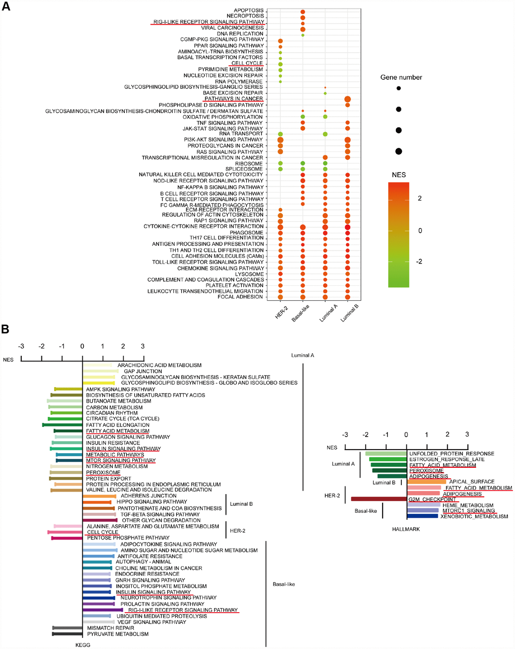 We further studied the differences in the top 30 KEGG pathways influenced by CD204 among the four subtype cells using NES scores and gene number screening. Each subtype had a specific pattern (Figure 6A). Special KEGG and HALLMARK pathways influenced by CD204 in subtype cells are shown in Figure 6B. We determined that considerable innate and adaptive immune pathways and cell interaction pathways in the four subtype cells were significantly affected by CD204. Otherwise, in the luminal A subtype cell, upregulated or downregulated special gene sets were involved in tumor-related metabolic pathways, including the TCA cycle, fatty acid metabolism, nitrogen metabolism, peroxisome, mTOR, and AMPK signaling pathways. In the luminal B subtype cells, the pathways were significantly influenced by CD204. Hippo and TGF-beta signaling pathways were found to be unique, suggesting important roles of CD204-related activities. In the HER2 subtype cell, cell cycle-related pathways were found to be among the top 30 KEGG or special pathways. In the basal-like subtype cell, RIG-I-like receptor pathways were found to be significantly and uniquely influenced by CD204. Interestingly, downregulated gene sets of fatty acid metabolism and adipogenesis were found in the luminal A subtype, whereas upregulated gene sets of those were shown in the HER-2-enriched subtype. Downregulated gene sets of insulin and mTOR signaling pathways were also found in the luminal A subtype, whereas upregulated gene sets of those were displayed in the basal-like subtype cell. This further suggests that CD204 plays different roles in each breast cancer subtype. The detailed and representative special pathways influenced by CD204 are shown in Supplementary Figure 1.