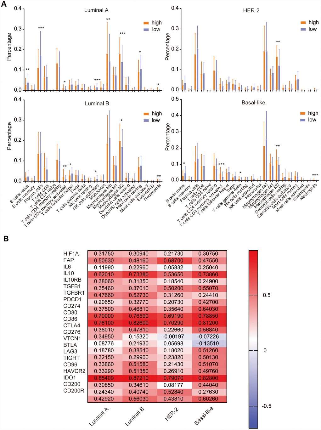 In addition, most TIME-related immunosuppressive molecules, including HIF1A, FAP, IL10, TGFB1, and multiple checkpoint inhibitors positively correlated with the CD204 expression levels in all subtypes; however, IL6, CD276, VTCN1, and IDO1 displayed different correlation values in different subtypes, providing potential evidence for different combination strategies of breast cancer immunotherapy in the four molecular subtypes.