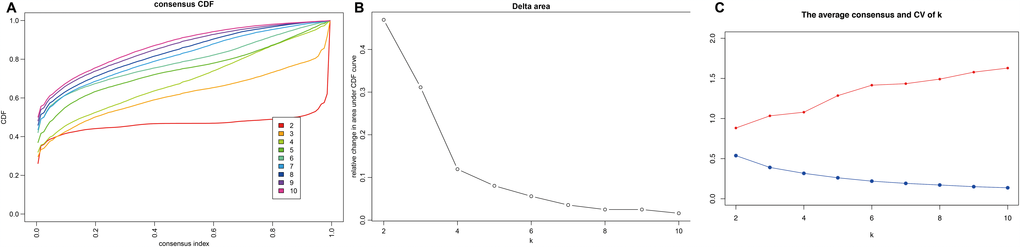 Consensus clustering was performed using the ConsensusClusterPlus package in R [30] to identify COAD subgroups based on the most variable CpG sites. The algorithm began by subsampling a proportion of items and features from the data matrix where each subsample was partitioned into up to k groups by k-means. This process was repeated for a user-specified number of repetitions; these multiple clustering algorithm runs were used to establish consensus values and to assess the stability of the identified clusters. Pairwise consensus values, defined as the proportion of clustering runs in which two items are grouped together, were calculated and stored in a consensus matrix for each k. Then, for each k, a final agglomerative hierarchical consensus clustering using a distance of 1-consensus values was completed and pruned to k groups. This algorithm determined “consensus” clustering by measuring the stability of clustering results from the application of a given clustering method to random subsets of data. In each iteration, 80% of the tumors were sampled, and the k-means algorithm with the Euclidean squared distance metric was used. These results were compiled over 100 iterations. After executing ConsensusClusterPlus, we obtained the cluster consensus and item-consensus results. Graphical output results included heatmaps of the consensus matrices, which displayed the clustering results, consensus cumulative distribution function (CDF) plots, and delta area plots, and which allowed us to determine an approximate number of clusters. Numbers of clusters were determined according to the following criteria: relatively high consistency within the cluster, relatively low coefficient of variation, and no appreciable increase in the area under the CDF curve. The coefficient of variation was calculated according to the following formula: CV = (SD/MN)*100%, in which SD represents the standard deviation and MN represents the average number of samples. The category number was defined as the area under the CDF curve and showed no significant change. In order to generate more detailed classification categories for COAD, larger numbers of categories were favored.