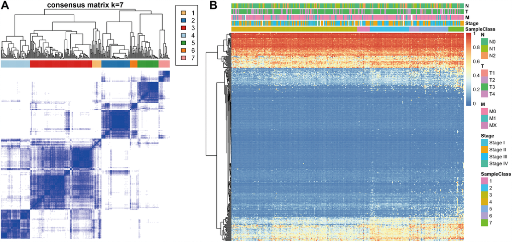 The heatmap corresponding to the consensus clustering was generated by the pheatmap R package. Consensus values from 0 (white) to 1 (dark blue) are depicted using a color gradient; the matrix is arranged so that items belonging to the same cluster are adjacent to each other. In this arrangement, a matrix corresponding to a perfect consensus will show a color-coded heatmap characterized by blue blocks along the diagonal on a white background. The color-coded heatmap corresponding to the consensus matrix obtained by applying consensus clustering to these cases is shown in Figure 2A and represents the consensus for k = 7, which displays a well-defined 7-block structure.