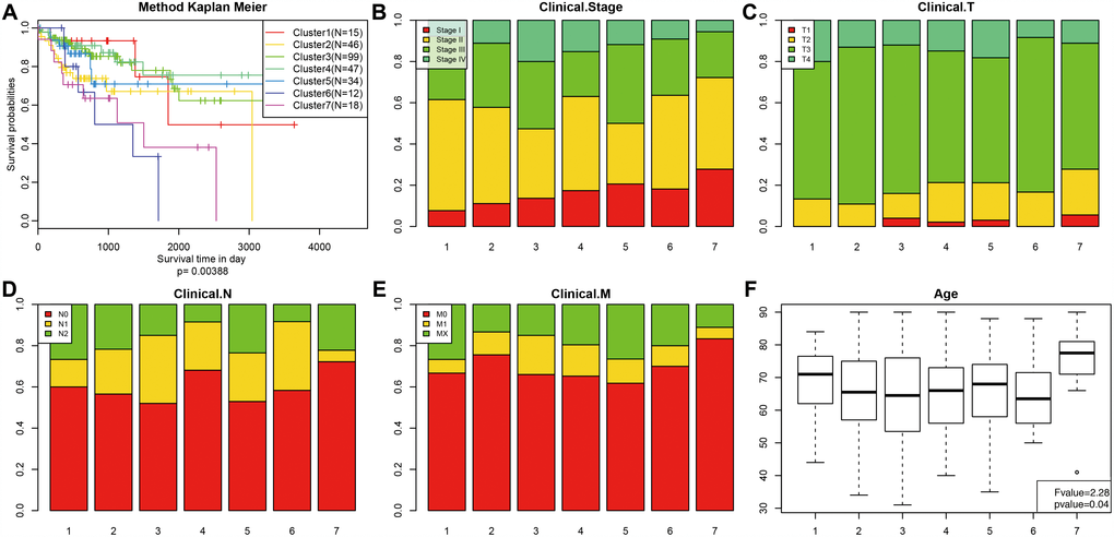Kaplan-Meier survival analysis revealed significant differences in prognosis among the 7 clusters (P<0.05). As shown in Figure 3A, Clusters 3 and 4 had the best prognoses, while Cluster 7 had the worst. We then analyzed intracluster proportions for the 7 clusters according to T category, N category, M category, stage, and age as shown in Figure 3B–3F, respectively. Tendencies for associations between characteristics and specific clusters were as follows: Clusters 3 and 5 with advanced stage; Clusters 4, 5, and 7 with lower T grade; Clusters 4 and 7 with lower N grade; Clusters 3, 4, and 5 with higher M grade; Cluster 7 with older age (Figure 3F). These results indicate that each clinical parameter was associated with a different intra-cluster proportion.