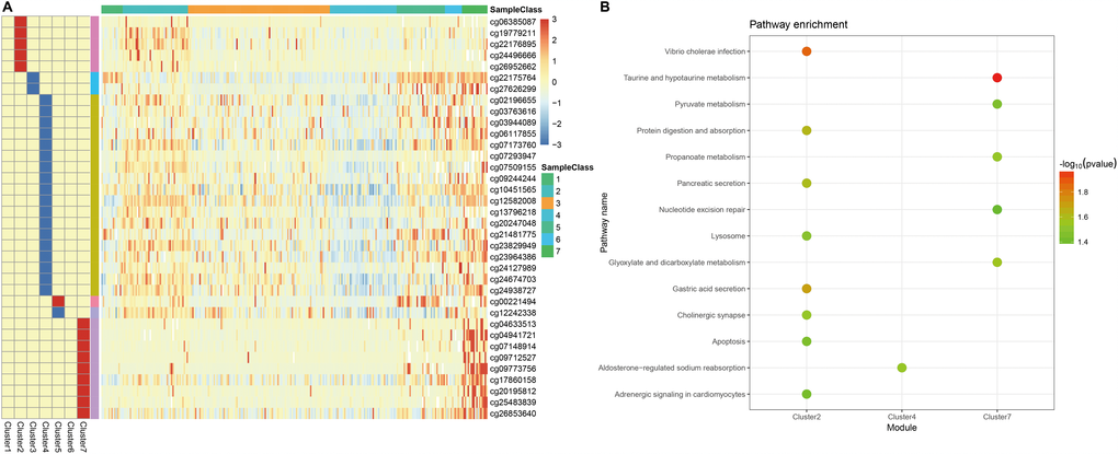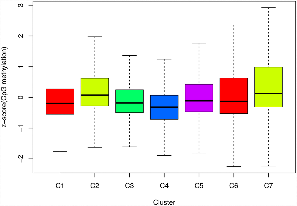 Next, we screened for cluster-specific methylation sites by including the methylation sites as characteristics of the clusters. First, differences among the 7 clusters were analyzed for every methylation site as described in Materials and Methods; the results are shown in Supplementary Table 10. Ultimately, 36 cluster-specific methylation sites shown in Supplementary Table 11 and the heatmap in Figure 5A were identified. Cluster 4 had the largest number of specific sites, all of which were hypomethylated, and the methylation level was the lowest among all the clusters (Figure 6). Genome annotations of the 36 specific sites were used to identify their corresponding genes (Supplementary Table 12). Analysis using clusterProfiler indicated that these genes were enriched in 14 pathways as shown in Figure 5B (Supplementary Table 13). These 14 pathways were only enriched in Clusters 2, 4, and 7; apoptosis, secretion, and other pathways were enriched in Cluster 2, the aldosterone-regulated sodium reabsorption pathway was enriched in Cluster 4, and multiple metabolic pathways were enriched in Cluster 7. These results indicated each cluster had unique gene expression and pathway characteristics.