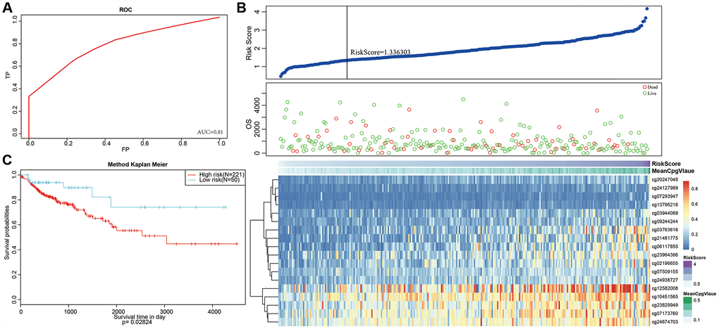 A risk score cut-off value of 1.336303 (Figure 8B) was used to divide the samples into high and low risk groups. Hypomethylation was associated with low-risk patients, while hypermethylation was associated with high-risk patients. Furthermore, prognoses differed significantly between the two groups as shown in Figure 8C.