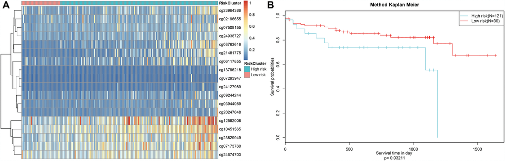 Finally, the prognostic model was used to predict outcomes in testing dataset patients. Methylation level profiles for the 18 CpG sites were obtained for testing dataset samples and risk scores were calculated using the prognostic model. Sorting the samples by risk score produced the heatmap shown in Figure 9A, which indicated that risk scores increased as methylation levels increased. Testing dataset samples were then divided into high-risk and low-risk groups using the cut-off score of 1.336303. Prognoses again differed significantly between the two groups (Figure 9B, P=0.0321). These results were consistent with those obtained from the training dataset, demonstrating the predictive accuracy and stability of our model.