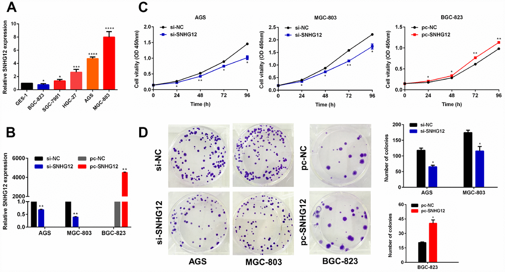 To determine the function of SNHG12 in GC cells, we first examined its expression in GC cell lines by performing quantitative real-time PCR (qRT-PCR) analysis. SNHG12 expression was higher in the AGS and MGC-803 cell lines but lower in the BGC-823 cell line than in the GES-1 (normal) cell line (Figure 2A). Thus, we performed knockdown experiments in AGS and MGC-803 cells, and conducted overexpression experiments in BGC-823 cells. A qRT-PCR analysis confirmed that transfection with small interfering RNA (siRNA) for SNHG12 (si-SNHG12) efficiently silenced SNHG12 in AGS and MGC-803 cells, while transfection with an overexpression plasmid (pc-SNHG12) upregulated SNHG12 in BGC-823 cells (Figure 2B).