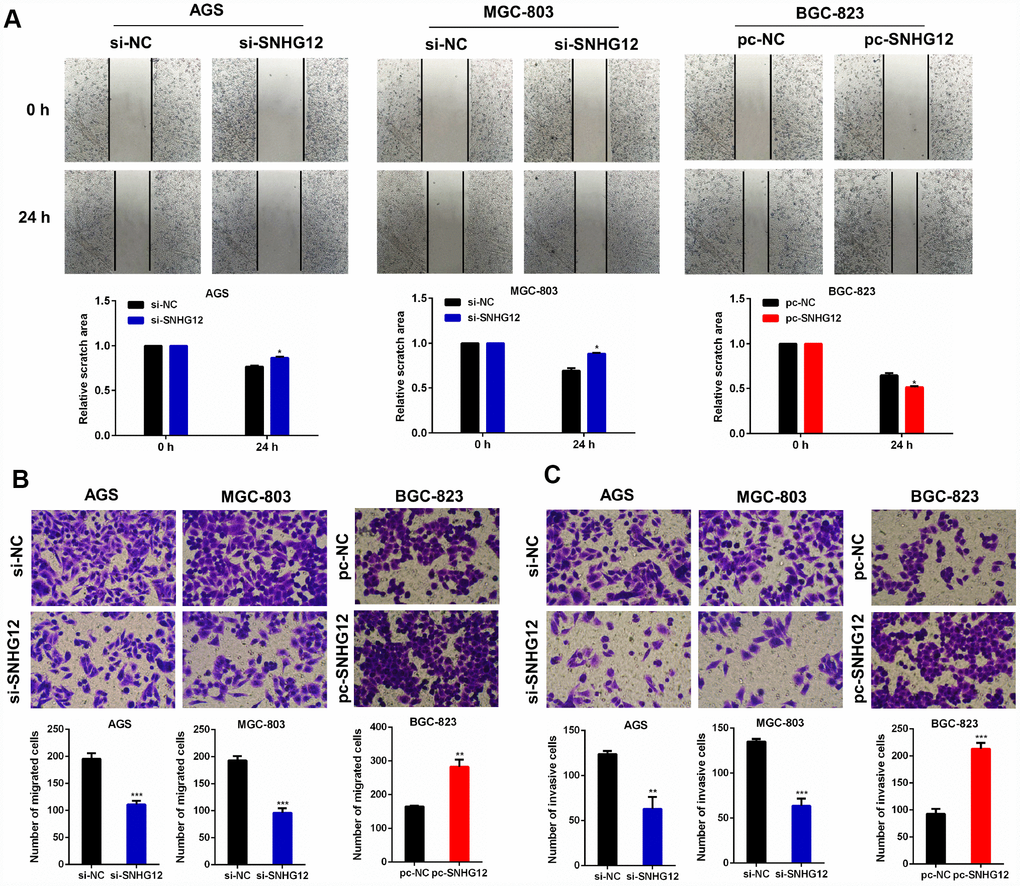 To explore the effects of SNHG12 on GC cell migration and invasion, we performed wound healing and Transwell migration/invasion experiments. The wound healing assay demonstrated that the knockdown of SNHG12 suppressed the migration of AGS and MGC-803 cells, while the overexpression of SNHG12 promoted the migration of BGC-823 cells (Figure 3A). Similar results were observed in the Transwell migration assay: the number of cells passing through the polycarbonate membrane decreased after the knockdown of SNHG12 in AGS and MGC-803 cells, but increased after the overexpression of SNHG12 in BGC-823 cells (Figure 3B). A Transwell invasion assay revealed that knocking down SNHG12 substantially lowered the invasive abilities of AGS and MGC-803 cells, while overexpressing SNHG12 enhanced the invasion of BGC-823 cells (Figure 3C).