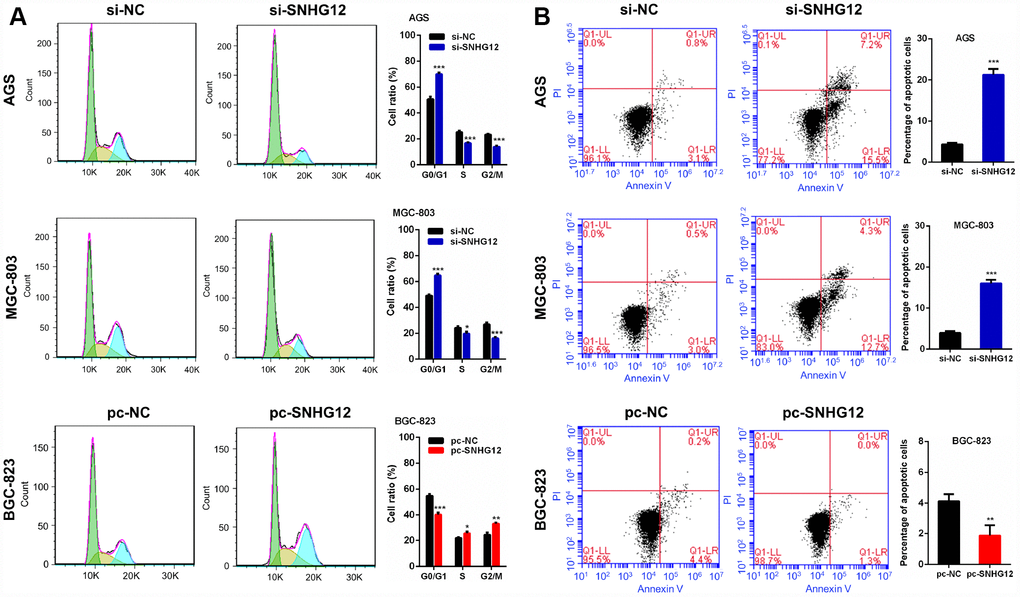 The effects of SNHG12 on cell cycle progression and apoptosis in GC cells were evaluated by flow cytometry. The knockdown of SNHG12 in AGS and MGC-803 cells increased the number of cells in G0/G1 phase but reduced the number of cells in S phase and G2/M phase. On the other hand, the overexpression of SNHG12 in BGC-823 cells reduced the number of cells in G0/G1 phase but increased the number of cells in S phase and G2/M phase (Figure 4A). An apoptosis analysis revealed that knocking down SNHG12 promoted apoptosis in AGS and MGC-803 cells, while overexpressing SNHG12 inhibited apoptosis in BGC-823 cells (Figure 4B).