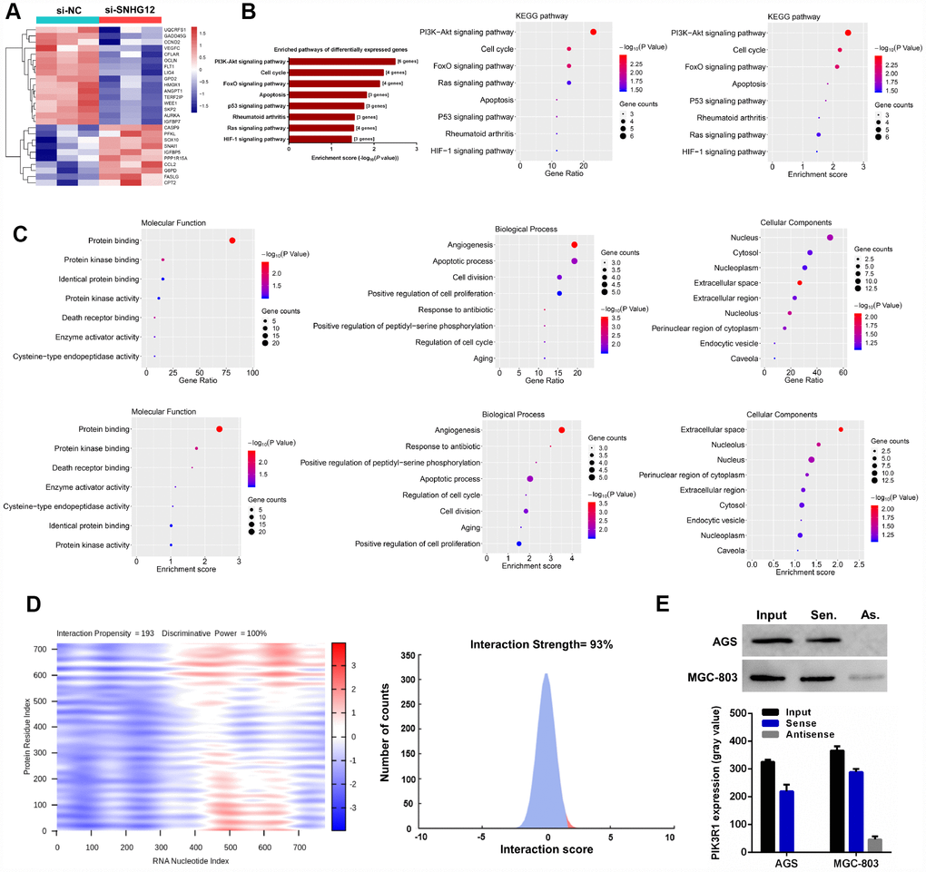For the RNA pulldown assay, the Biotin RNA Labeling Mix (Roche, Basel, Switzerland) was used to transcribe and label sense- or antisense-SNHG12 from the pcDNA 3.1-SNHG12 vector in vitro. An RNA structure buffer (Thermo, MA, USA) was used to induce secondary structure formation from the biotin-labeled RNAs. Streptavidin beads (Thermo) were washed three times with 500 μL of RNA immunoprecipitation wash buffer (Thermo) and then added to the biotinylated RNAs at 4 °C overnight. The overnight mixture was separated by a magnetic field so that streptavidin bead-RNA complexes could be obtained. Then, lysates of AGS or MGC-803 cells were added to the complexes and incubated on a rotator at room temperature for one hour. The incubated mixture was again separated with a magnetic field so that streptavidin bead-RNA-protein complexes could be obtained. These complexes were used for Western blotting with a PIK3R1 primary antibody.