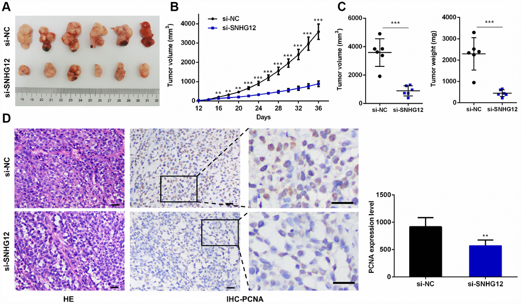 Having identified the growth-promoting effects of SNHG12 in GC cells in vitro, we sought to verify these results in vivo. AGS cells transfected with si-NC or si-SNHG12 were used to establish a subcutaneous xenograft tumor model in nude mice. The tumor volumes and weights were markedly lower in the si-SNHG12 group than in the si-NC group (Figure 7A–7C). Hematoxylin and eosin staining revealed that the number of tumor cells was lower in the si-SNHG12 group than in the si-NC group, and immunohistochemistry analysis revealed that the protein expression of proliferating cell nuclear antigen (PCNA) was significantly lower in the si-SNHG12 group than in the si-NC group (Figure 7D).