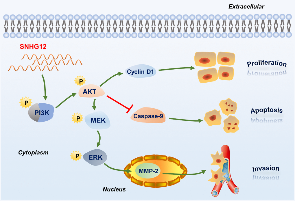 The levels of PI3K/AKT pathway proteins and downstream proteins were also altered after the knockdown or overexpression of SNHG12. These proteins, including p-MEK1/2, p-ERK1/2, cyclin D1, caspase 9 and MMP-2, are widely known to be essential for cell proliferation, apoptosis and invasion. In addition, inhibiting the PI3K/AKT pathway in SNHG12-overexpressing BGC-823 cells suppressed cell proliferation and invasion and induced apoptosis. Therefore, we speculated that SNHG12 promoted GC tumorigenesis by activating the PI3K/AKT pathway (Figure 8). In view of these findings, SNHG12 overexpression could be used as a biomarker of poor survival in GC patients.