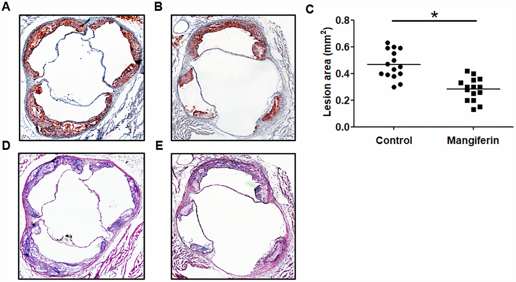 Eight-week-old male apoE-/- mice were purchased from Nanjing CAVENS Biological Technology Co., Ltd. and housed in an environmentally controlled room (22–26°C, 50% humidity) under 12-h light/dark cycles with free access to drinking water and food. After the animals were fed a chow diet for 2 weeks, they were randomly separated into a mangiferin group and a control group (n=15/group), and both groups were fed an HFD (containing 10% fat oil, 2% cholesterol, 4% whole milk powder and 0.5% sodium cholate) for 12 weeks. When the HFD started, mice in the mangiferin group were intraperitoneally injected with 15 mg/kg of mangiferin every day. The control group was administered an equivalent volume of phosphate-buffered saline (PBS). At week 14, the mice were sacrificed, and blood and tissue samples were taken for further assessment.