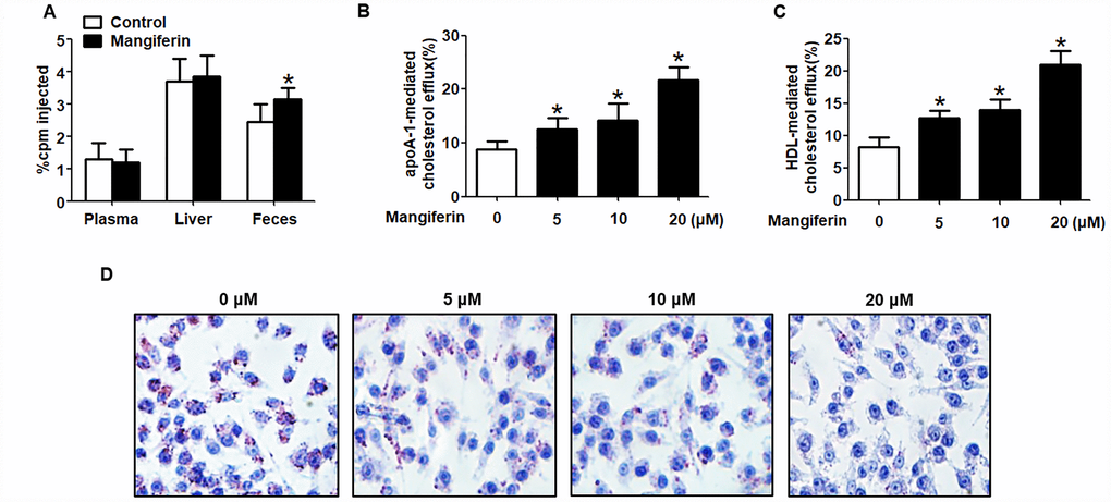 Given that the progression of AS is closely related to an impaired RCT rate [19], we further determined whether mangiferin-induced athero-protection is attributed to stimulation of RCT. ApoE-/- mice were intraperitoneally injected with [3H]-cholesterol- labeled RAW264.7 macrophages. Then, [3H]-labelled cholesterol levels in plasma, liver and feces were measured to assess cholesterol distribution along the RCT pathway by liquid scintillation counting (LSC). The results showed that [3H]-cholesterol counts in plasma and liver did not differ markedly, while [3H]-cholesterol tracer amounts in feces were markedly amplified in mangiferin-treated mice compared with those of the control group (Figure 2A). These results are consistent with the cholesterol mass in plasma lipoprotein distribution, namely, increased HDL levels and decreased LDL in mangiferin-treated mice, demonstrating that mangiferin promotes macrophage-to-feces RCT in vivo.